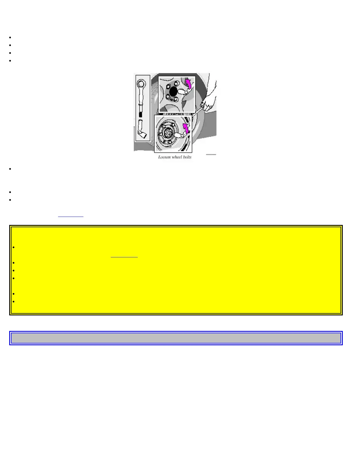 With the car still on the ground, use the lug wrench to loosen the wheel bolts 1/2 - 1 turn. Turn the bolts