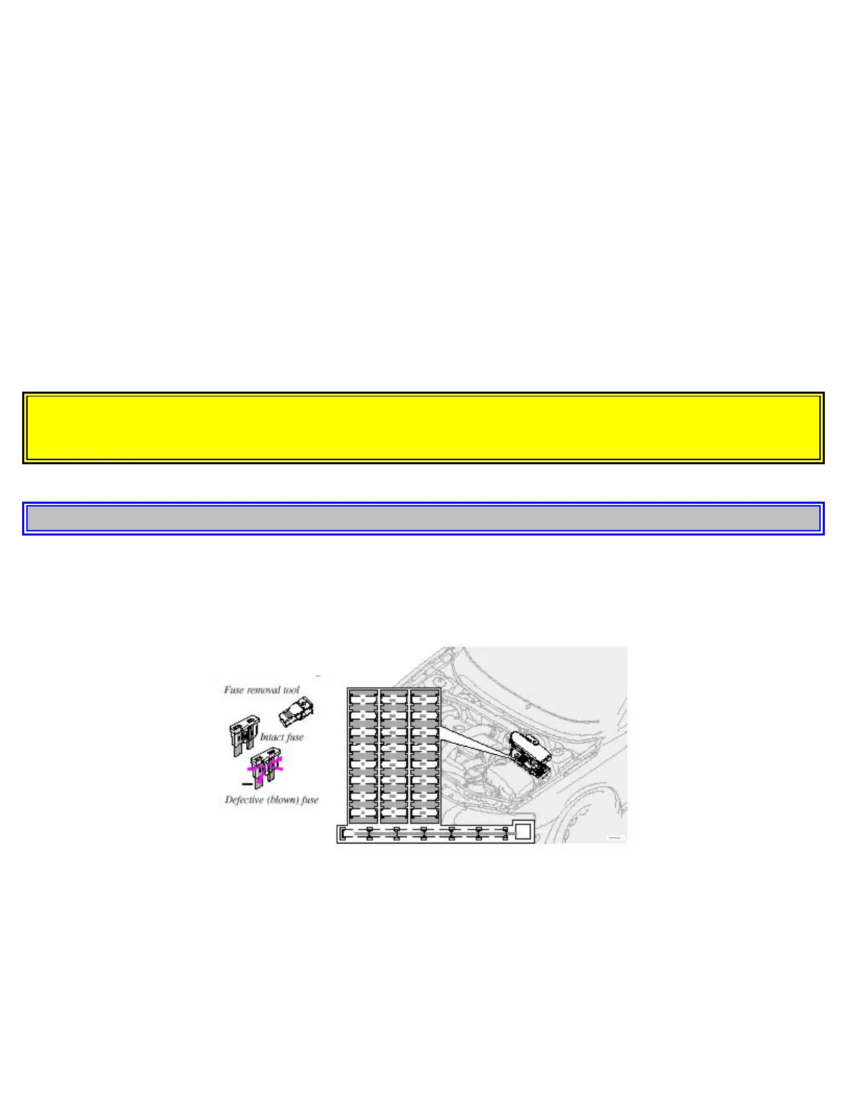 Never use fuses with higher amperage that those stated on the following pages. Doing so could overload the car's
