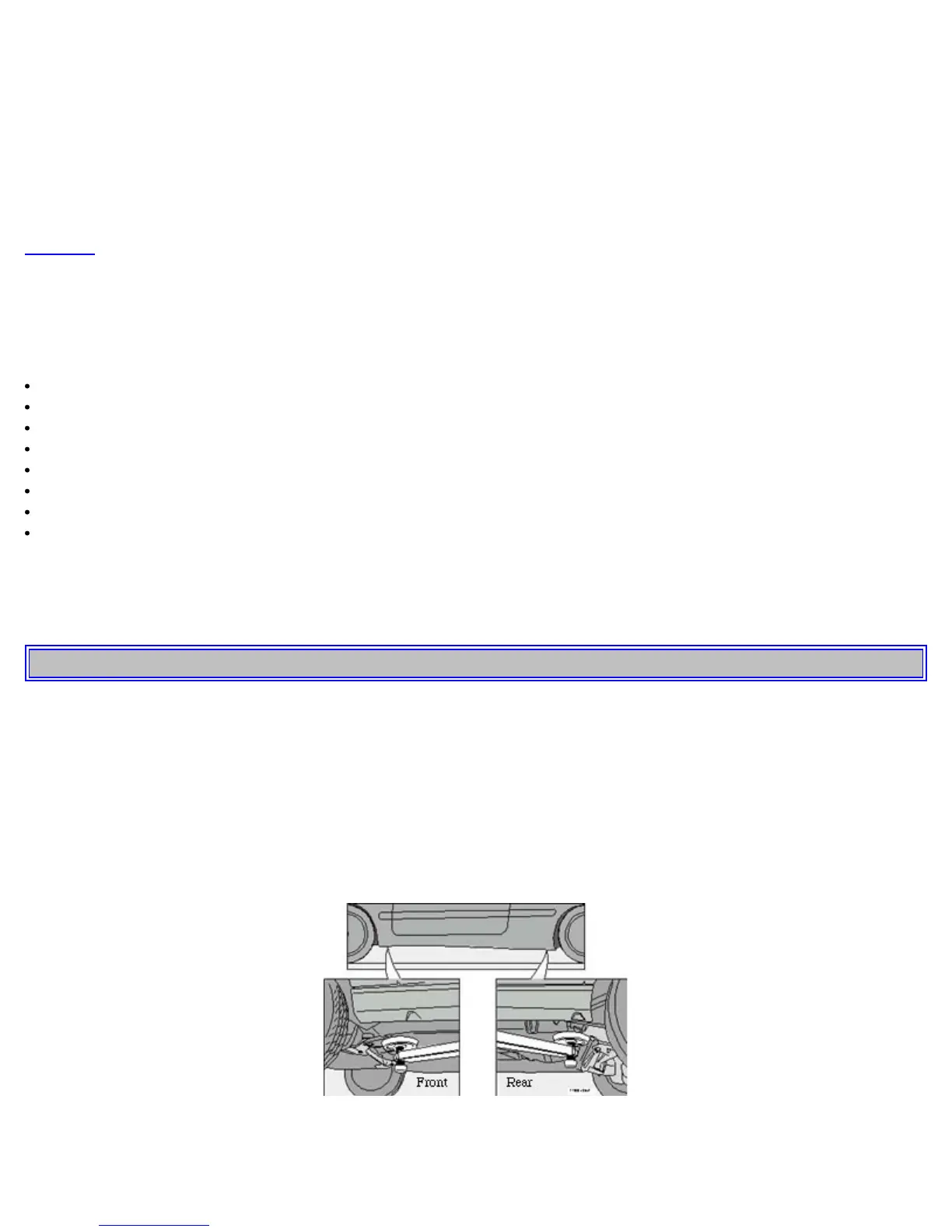 If a garage jack is used to lift the car, the two jack attachments points should be used. They are specially reinforced to