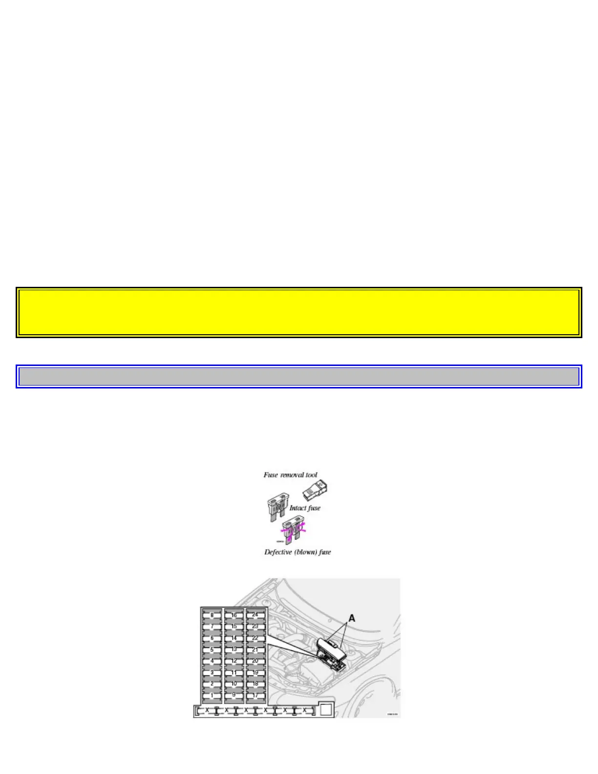 Never use fuses with higher amperage that those stated on the following pages. Doing so could overload the car's