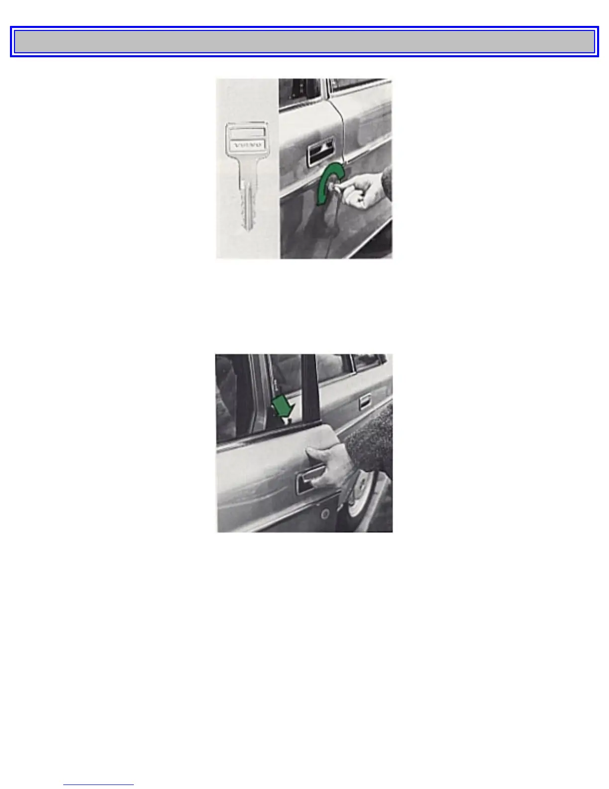 Both front doors can be unlocked by using the key. Turning the key 1/4 turn counterclockwise lifts the