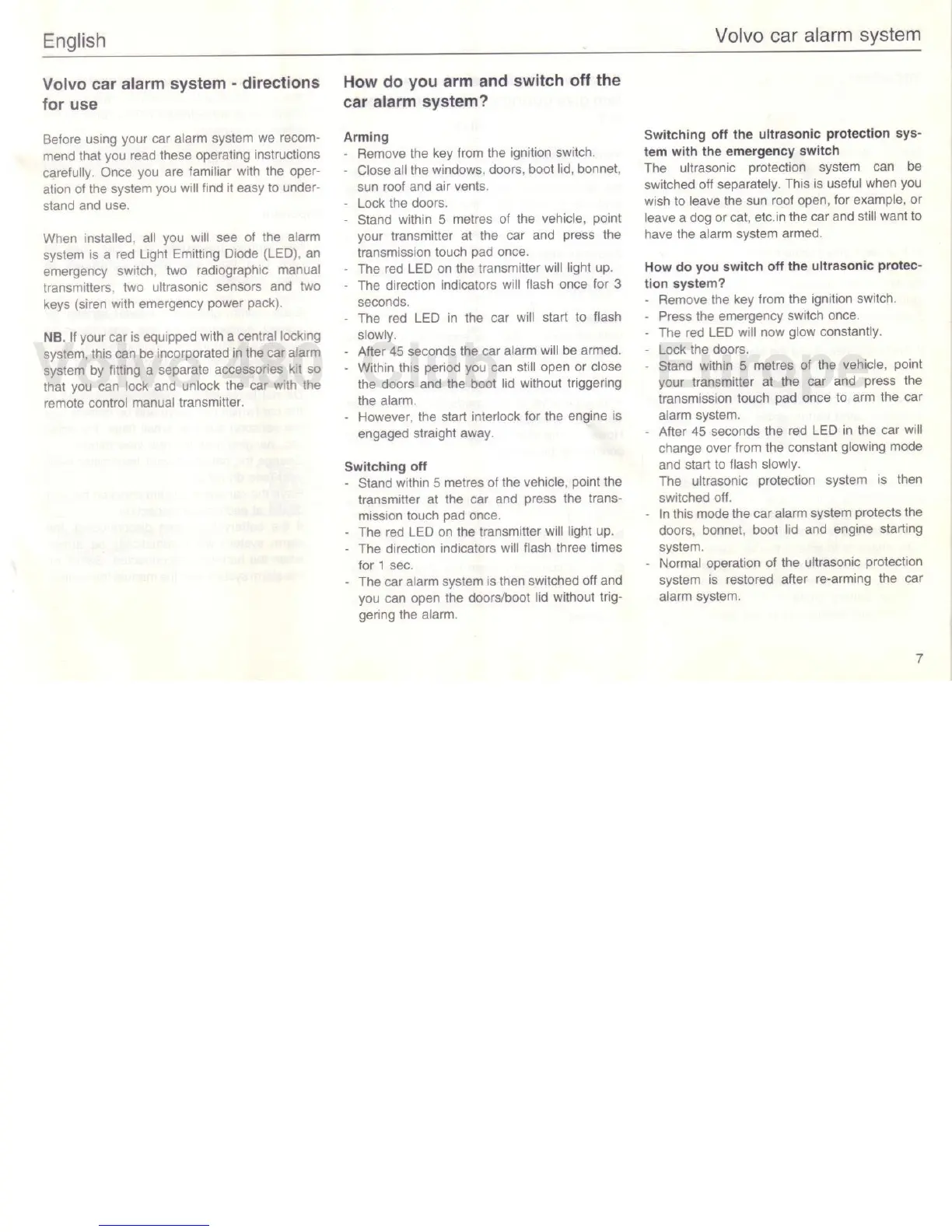 Volvo 440 - Volvo Car Alarm System - Directions for Use; Arming and Disarming; Disabling Ultrasonic Protection