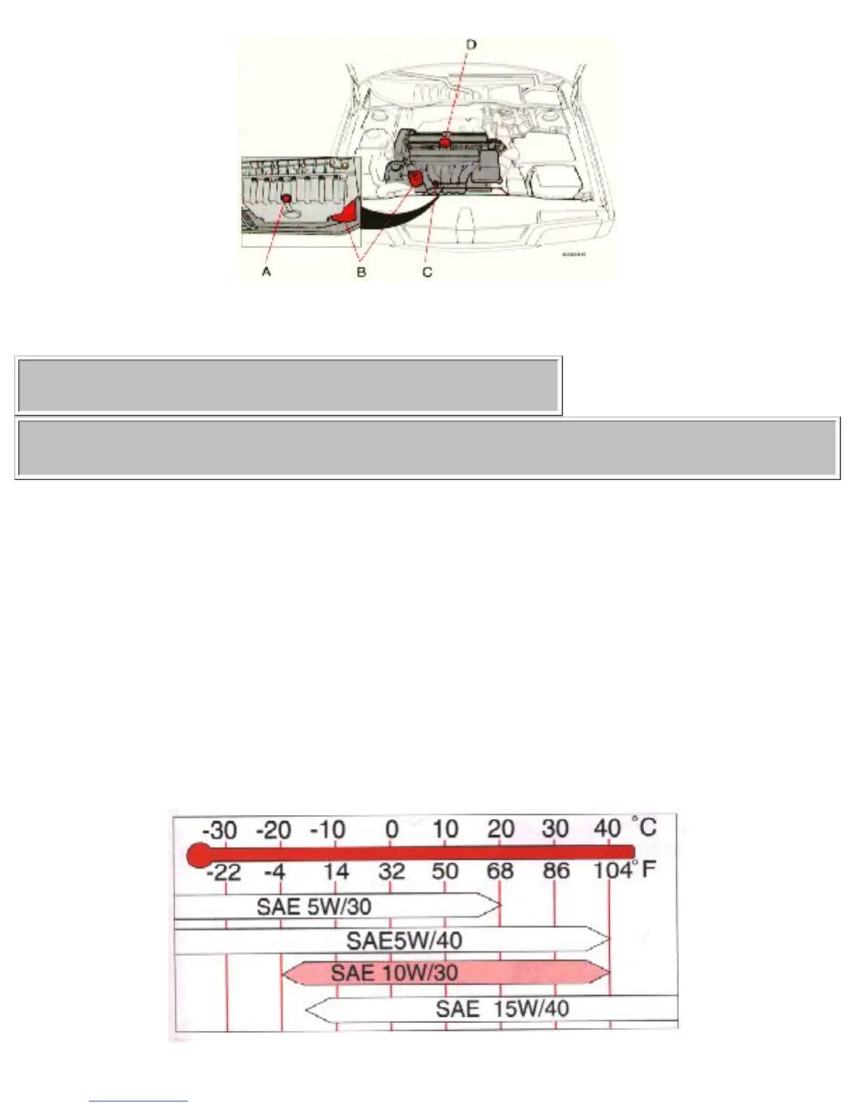 A - Drain plug, B - Oil filter, C - Oil dipstick, D - Oil filler cap