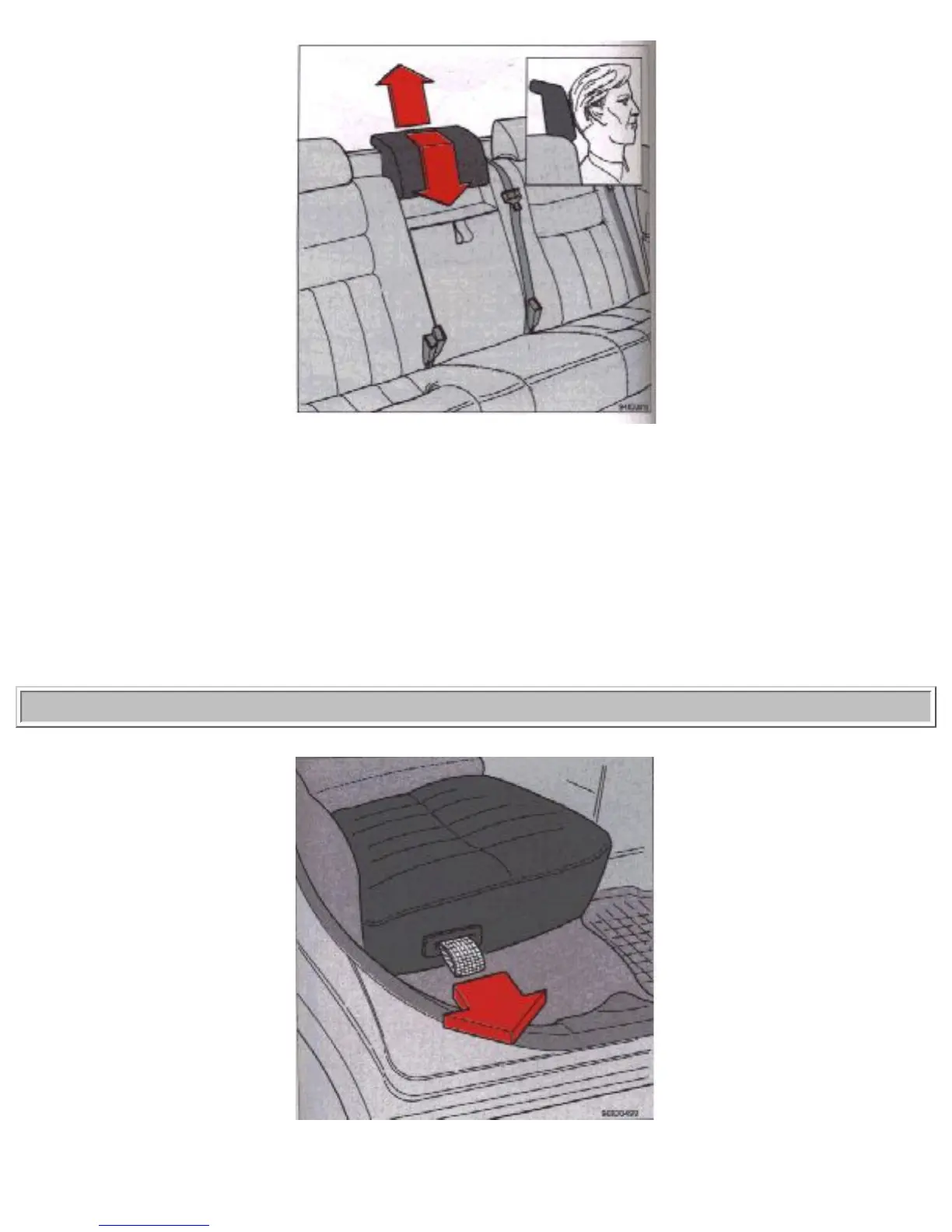 The rear seat head restraints can be raised by pulling straight up or lowered by grasping the restraint,