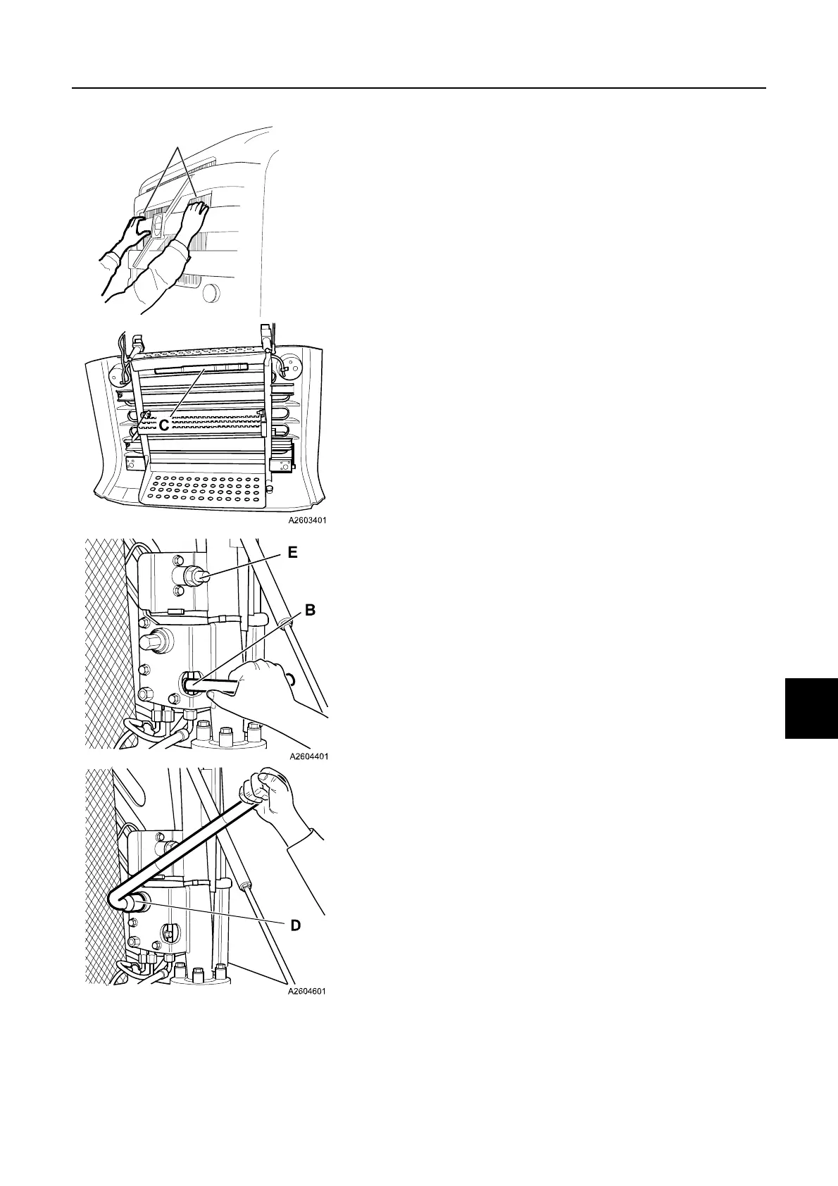 3 Turn the hydraulic pump valve (B) to the downward position