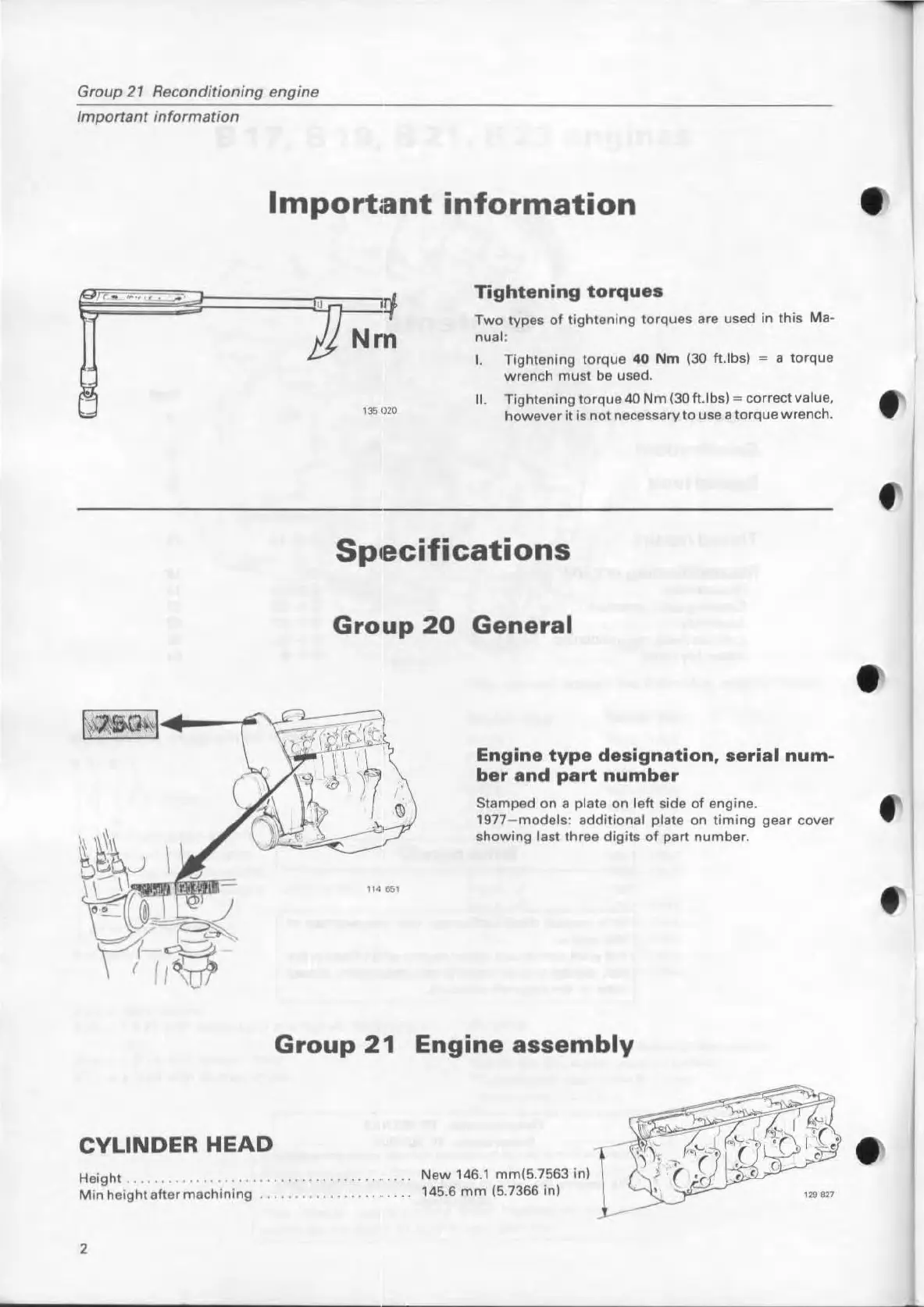 Volvo B 17 - Tightening torques; Cylinder block and piston specifications