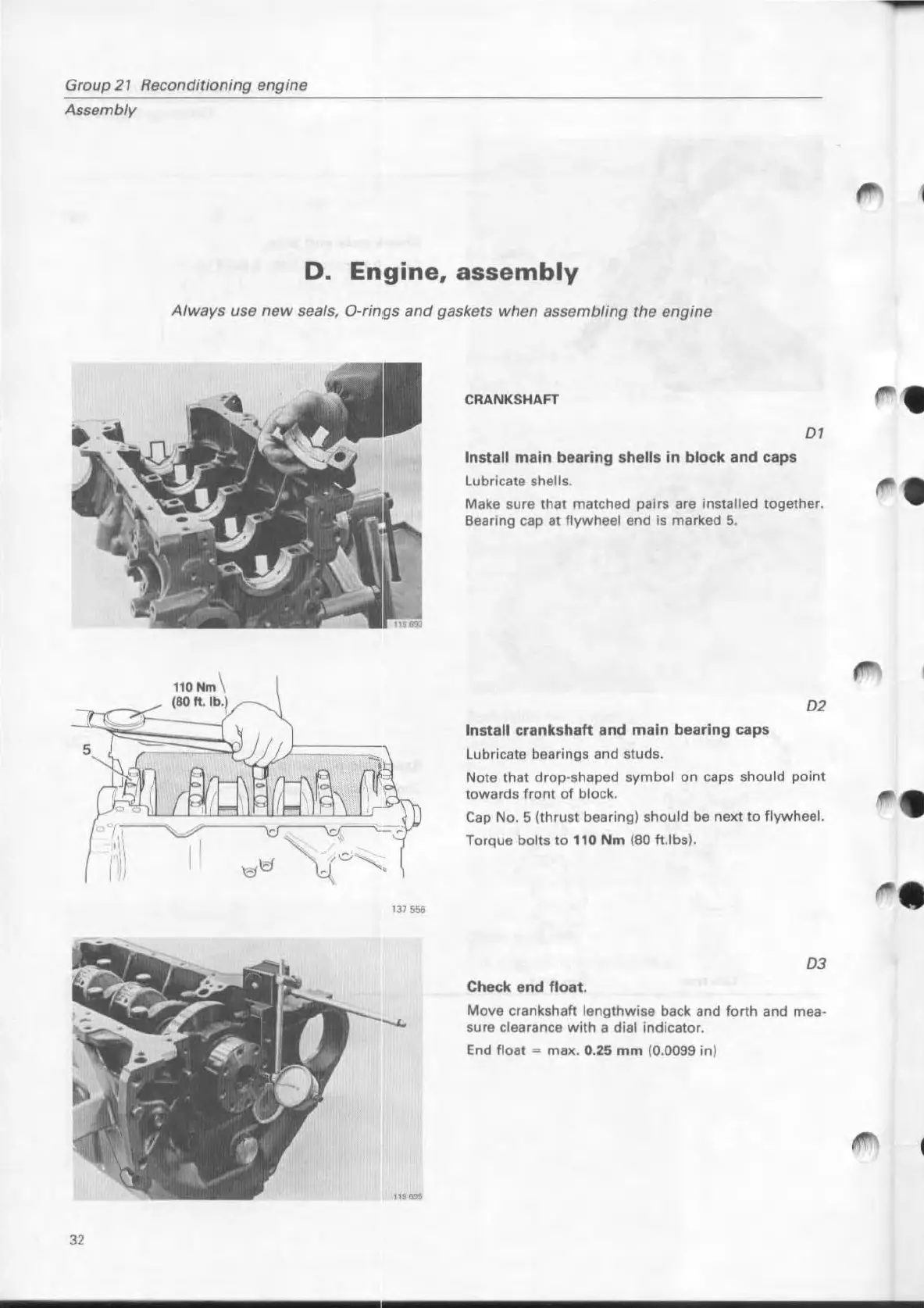 Volvo B 21 - Engine Assembly Procedures; Crankshaft Installation Steps