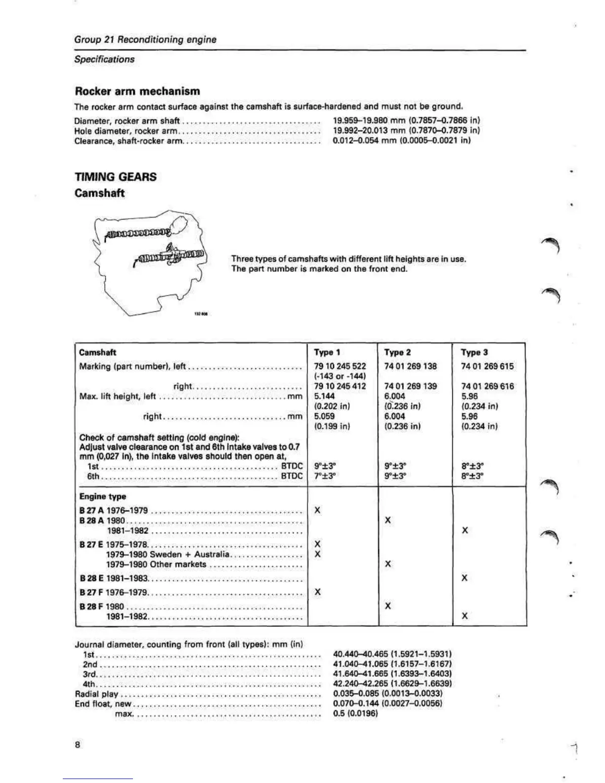 Clearance, shaft-rocker arm 0.012-0.054 mm (0.0005-0.0021 in)