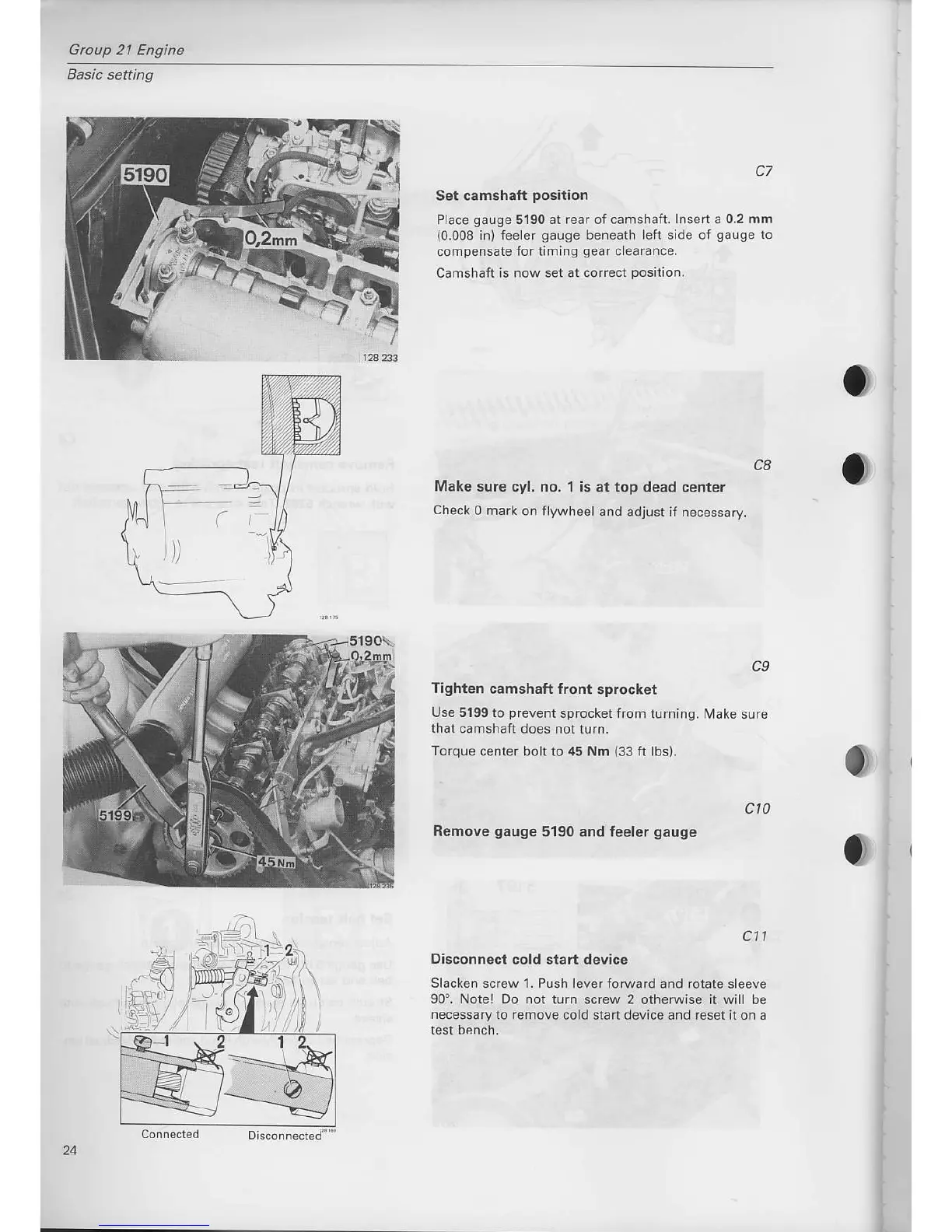 Volvo D 20 - Set Camshaft Position; Tighten Camshaft Front Sprocket; Disconnect Cold Start Device