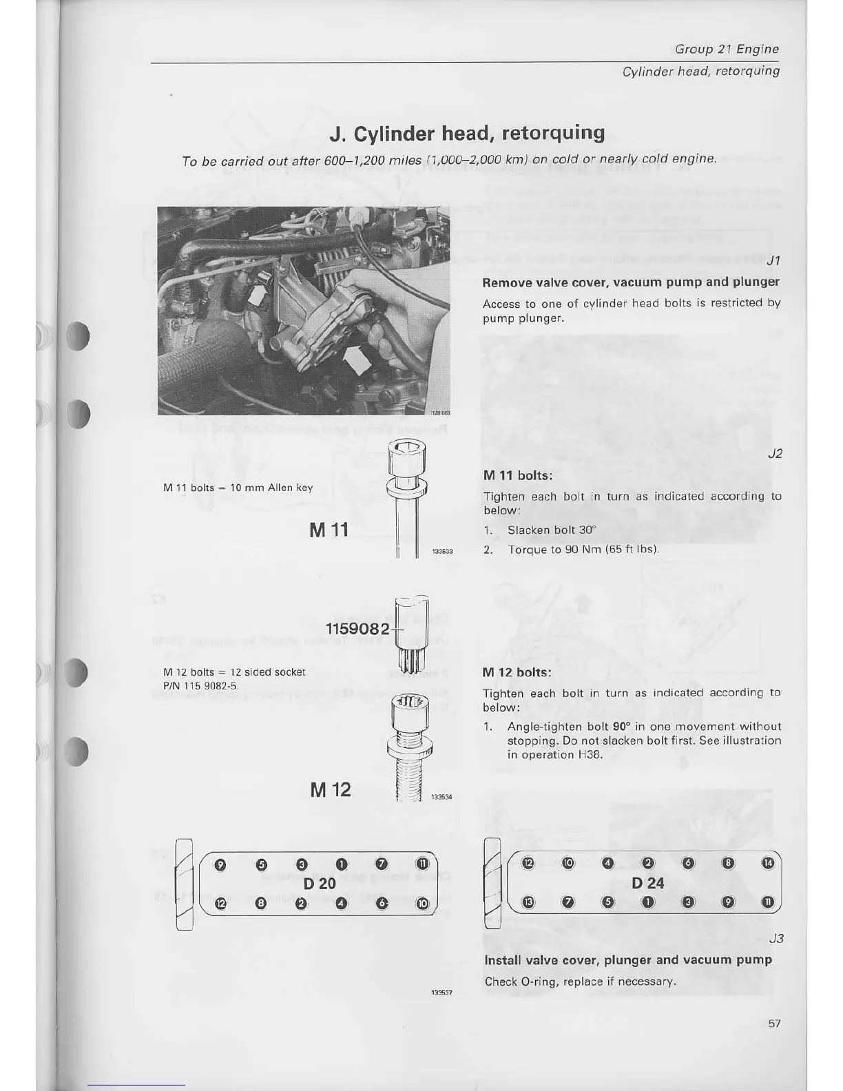 Volvo D 20 - Cylinder Head, Retorquing; M 12 Bolts; Install Valve Cover, Plunger and Vacuum Pump