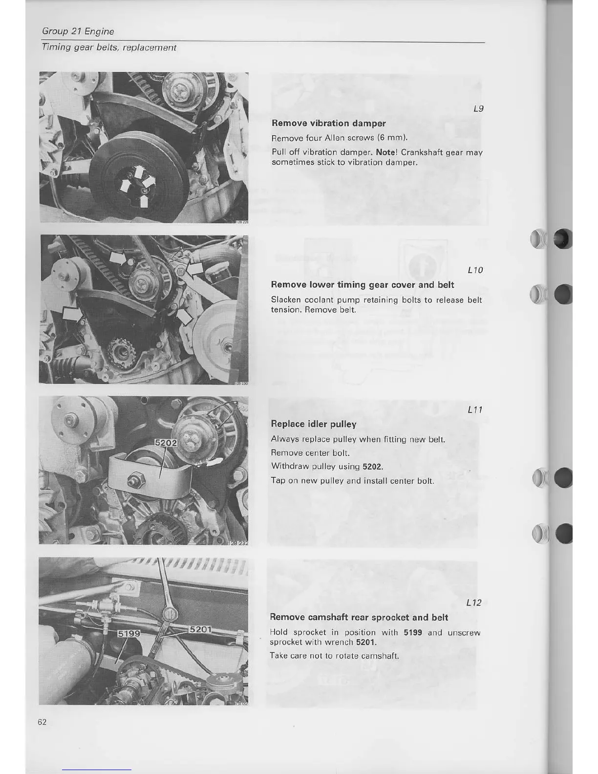 Volvo D 20 - Remove Vibration Damper; Remove Lower Timing Gear Cover and Belt; Replace Idler Pulley; Remove Camshaft Rear Sprocket and Belt