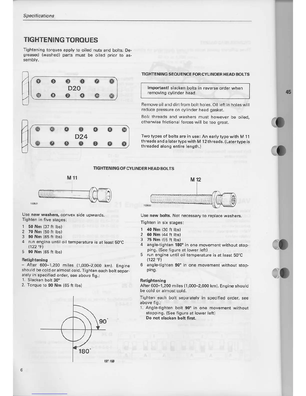 Volvo D24 - Tightening Sequence for Cylinder Head Bolts; Tightening of Cylinder Head Bolts
