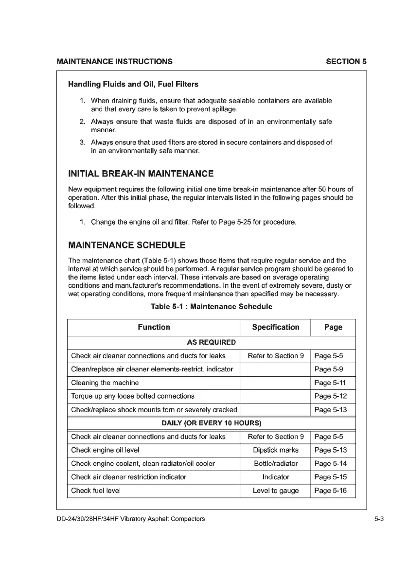 Volvo DD34HF - Initial Break-In Maintenance; Handling Fluids and Oil, Fuel Filters; Maintenance Schedule