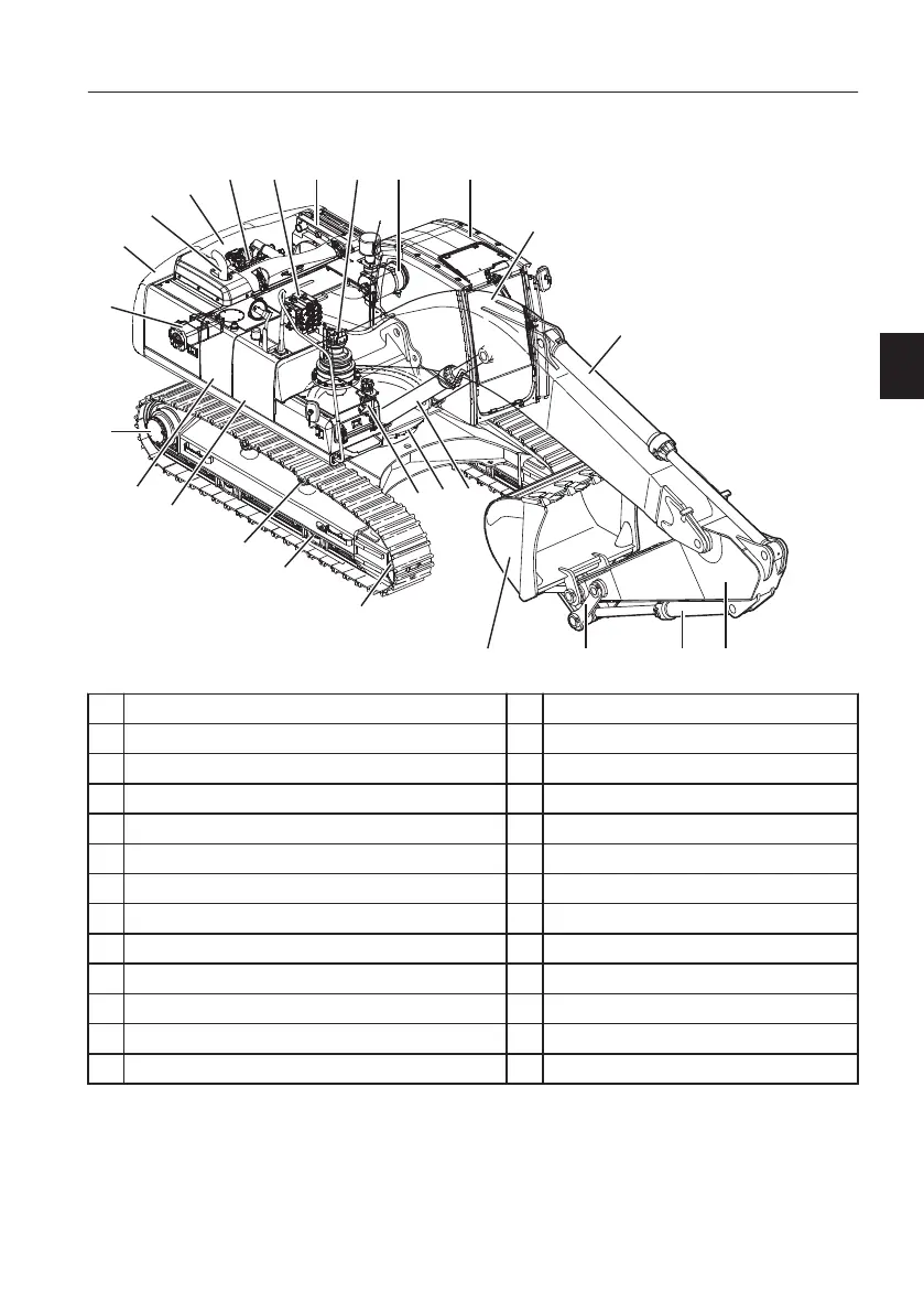 1 Dipper arm cylinder 14 Track motor and gearbox