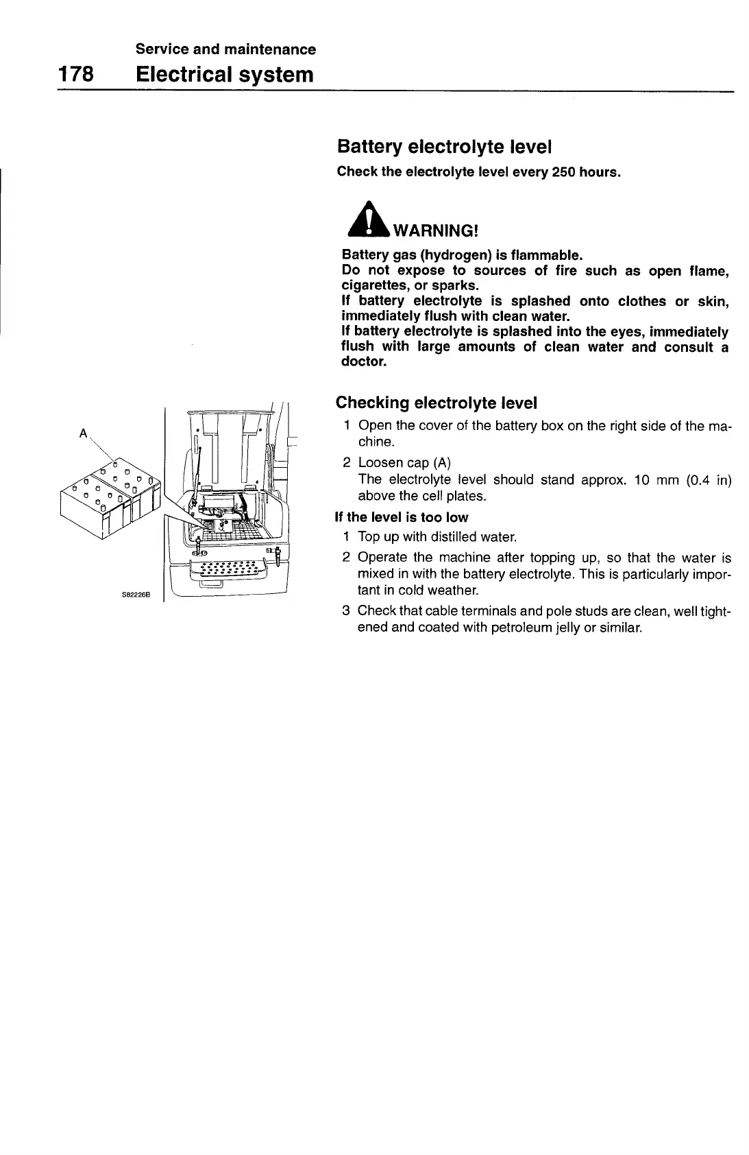 Check the electrolyte level every 250 hours.