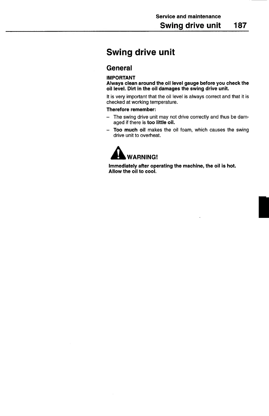 oil level. Dirt in the oil damages the swing drive unit.