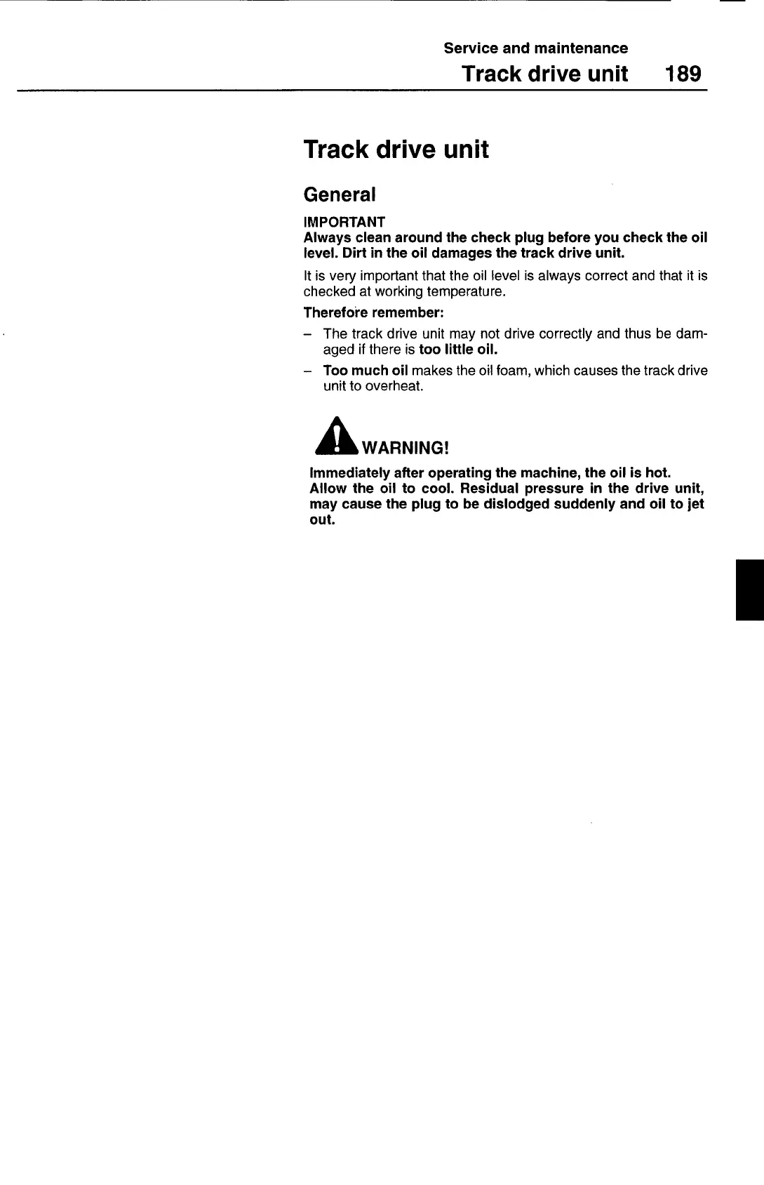 level. Dirt in the oil damages the track drive unit.