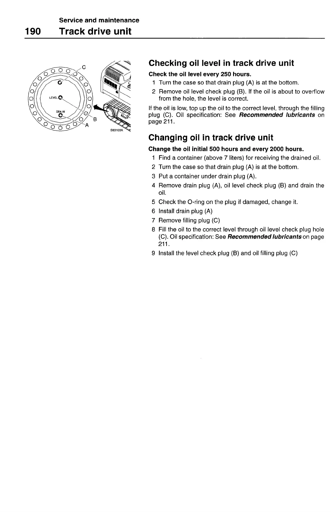 2 Remove oil level check plug (B). If the oil is about to overflow