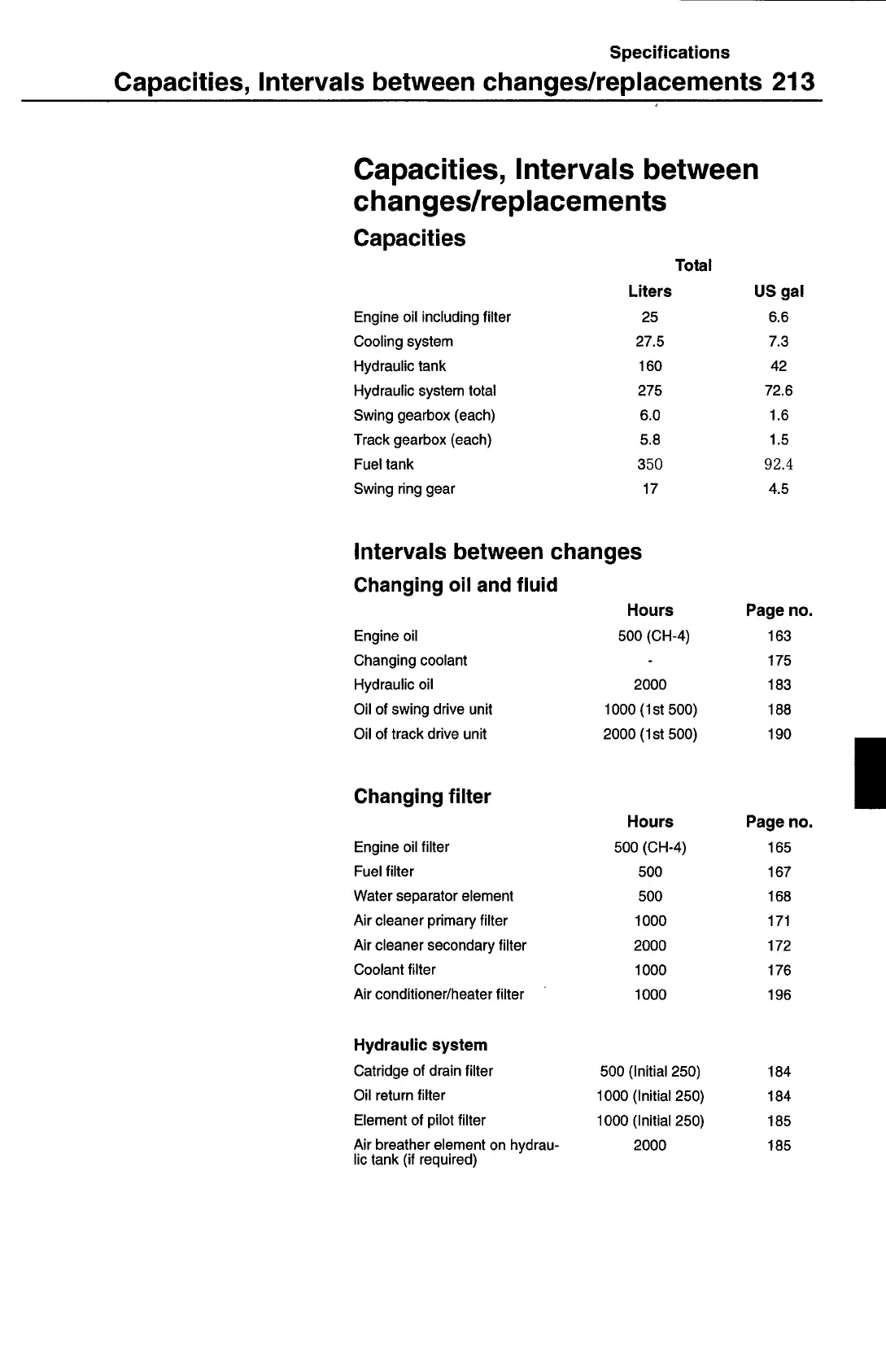Capacities, Intervals between changes/replacements 213
