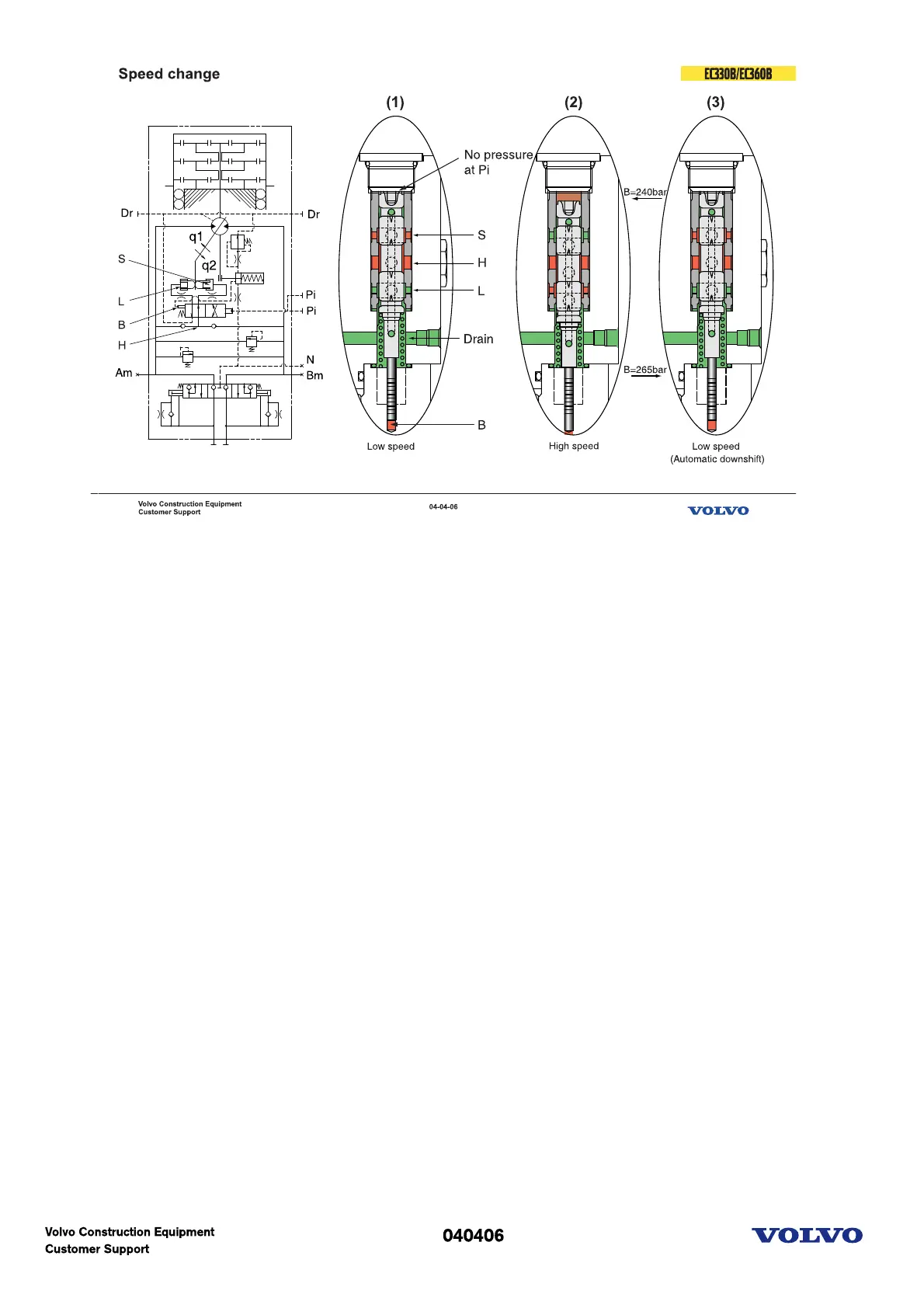 -Speed change spool is pushed upward against pi pressure, Supply pressure H is connected to S port.