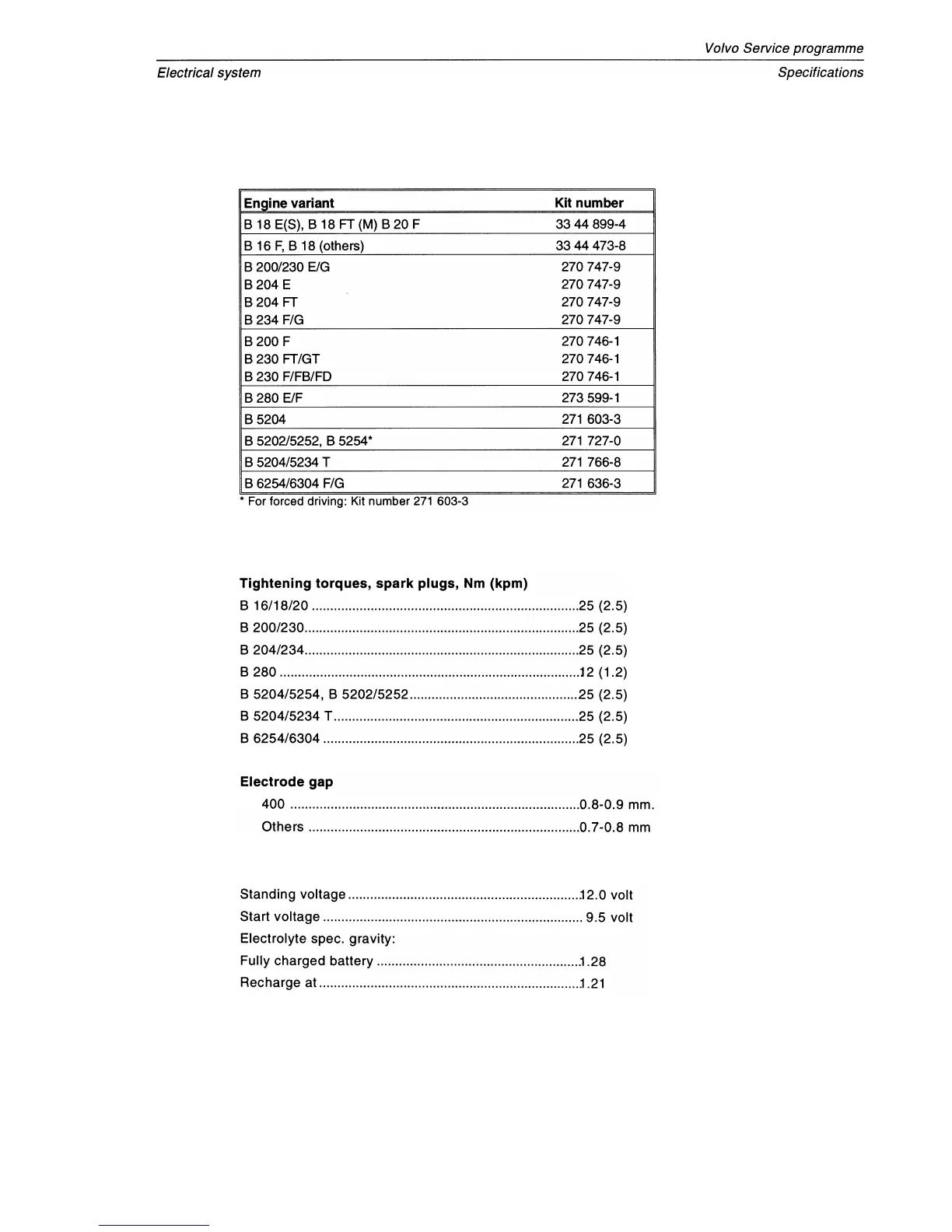 Volvo Engine - Electrical System; Spark Plug Kit Numbers and Gaps; Battery Voltage and Gravity Specifications