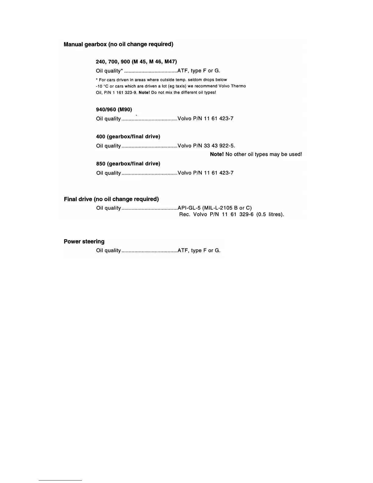 Volvo Engine - Gearbox, Final Drive, and Power Steering; Manual Gearbox Oil Quality; Final Drive Oil Quality; Power Steering Oil Quality