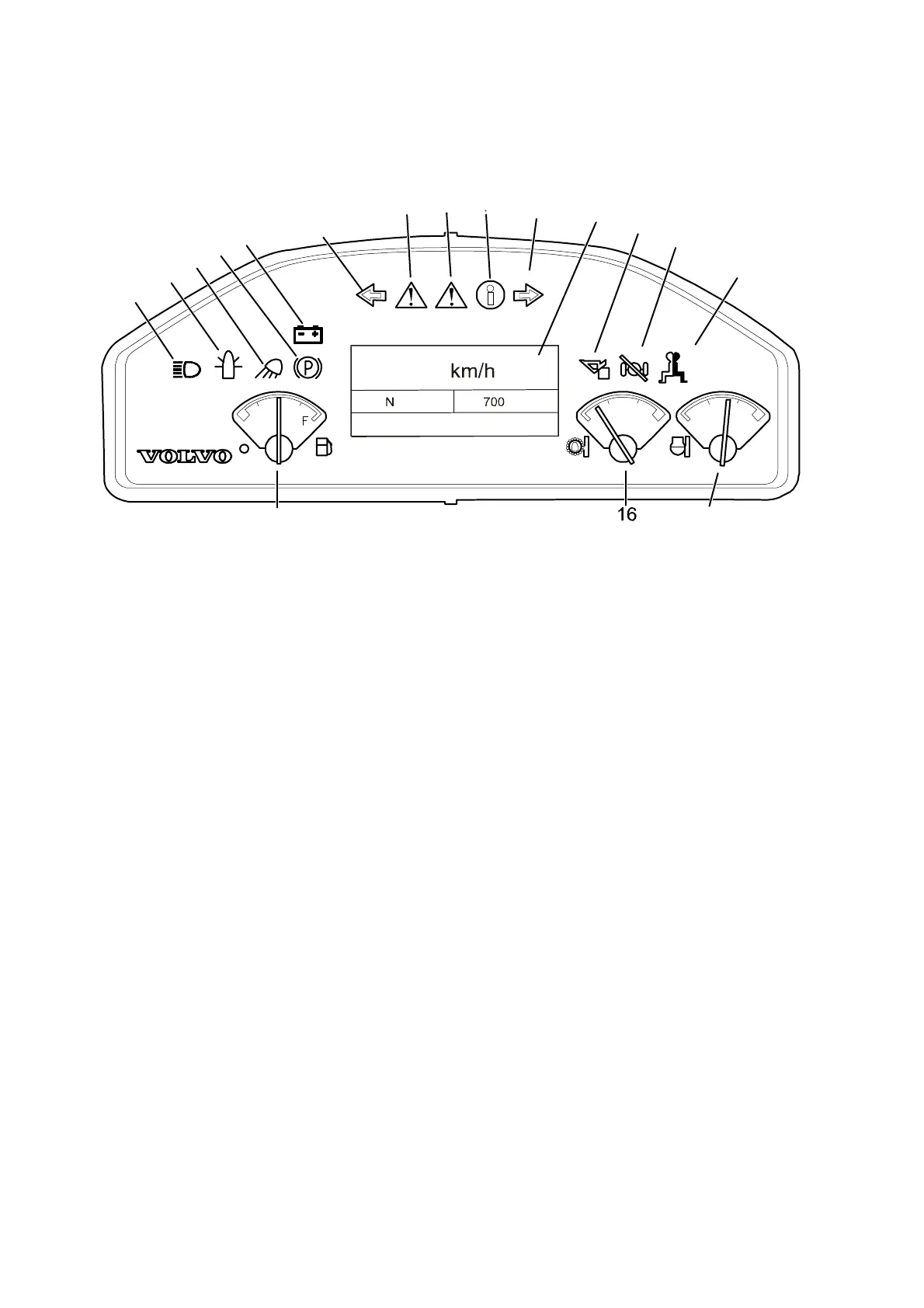 6 Working lights (amber) 16 Transmission oil temperature