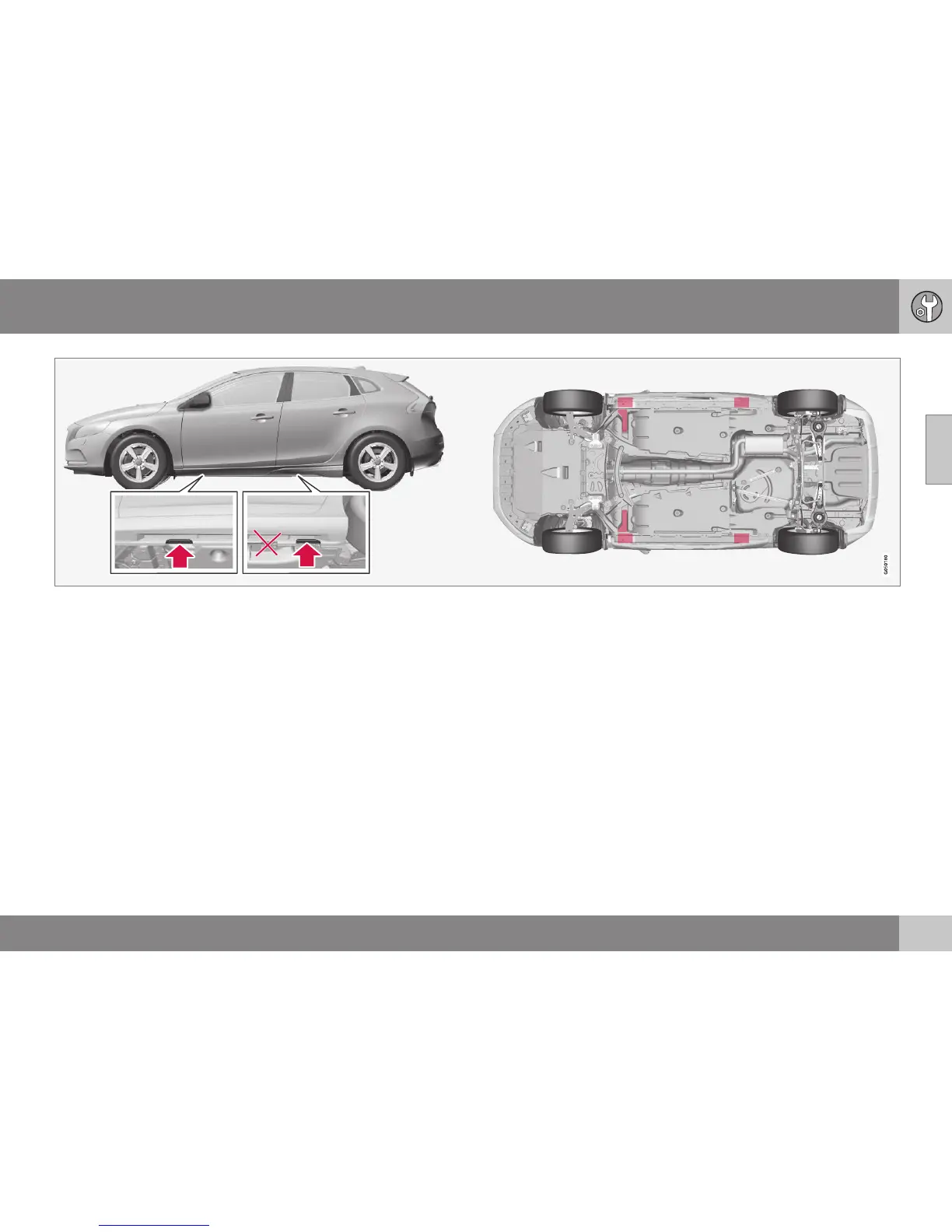 Jacking points (arrows) for the jack that belongs to the car and lifting points (marked in red).