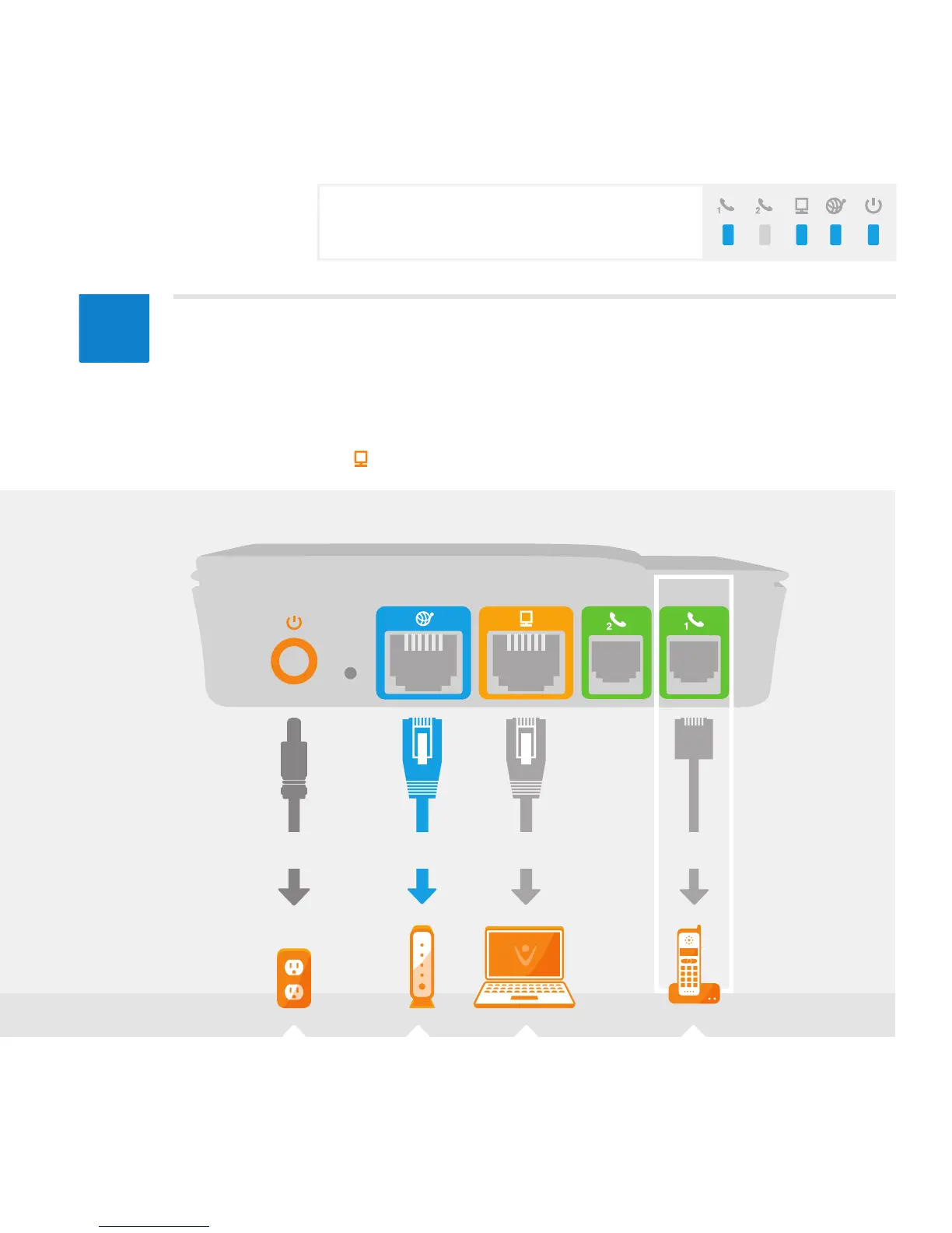 Connect your phone cord to the green port (Phone 1) on the Vonage