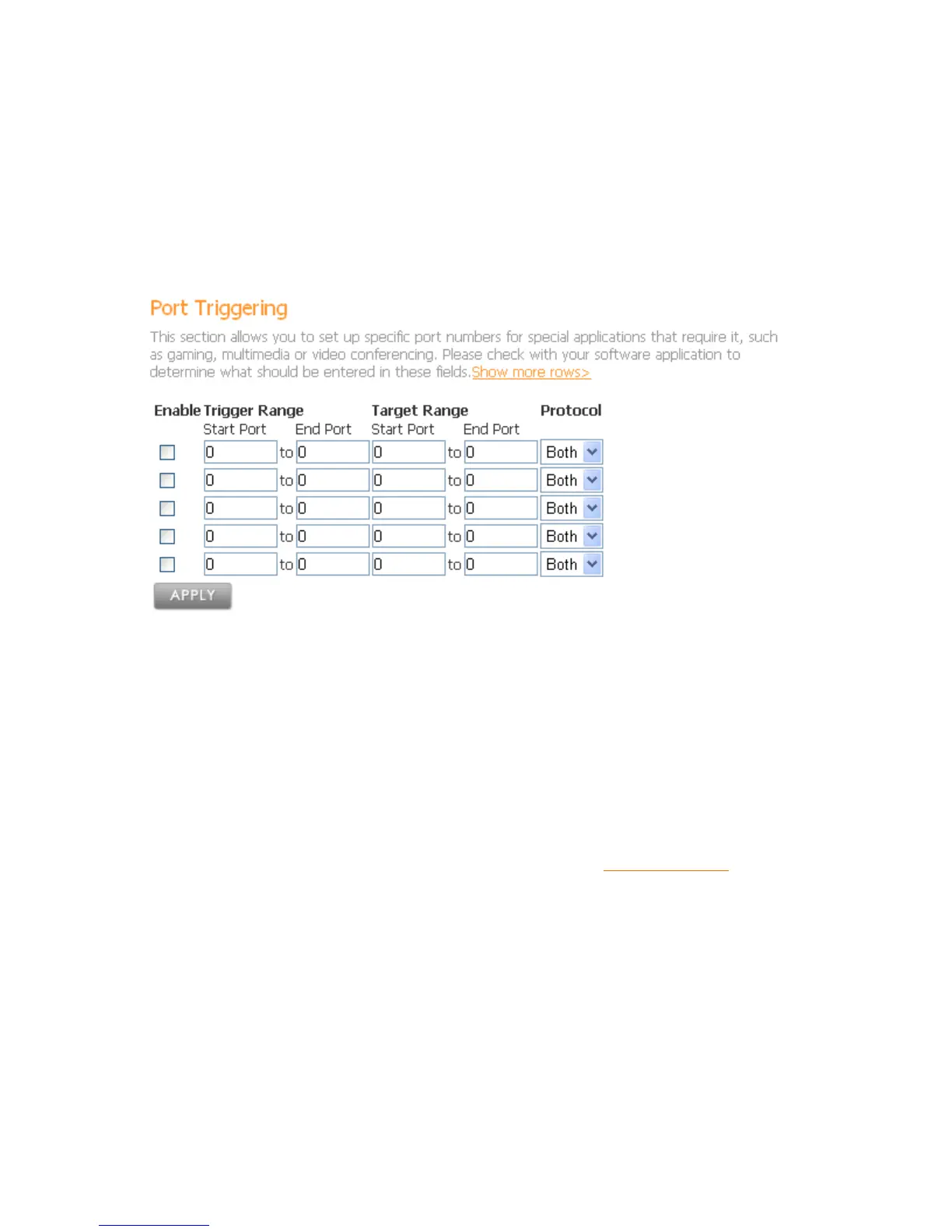 If you need to specify more than 5 port triggering rules, click on the Show more rows>