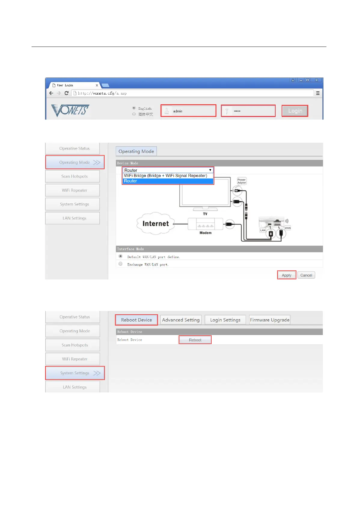 4. In “Operating Mode”, change Device mode to “Router” mode, click “Apply” Button;