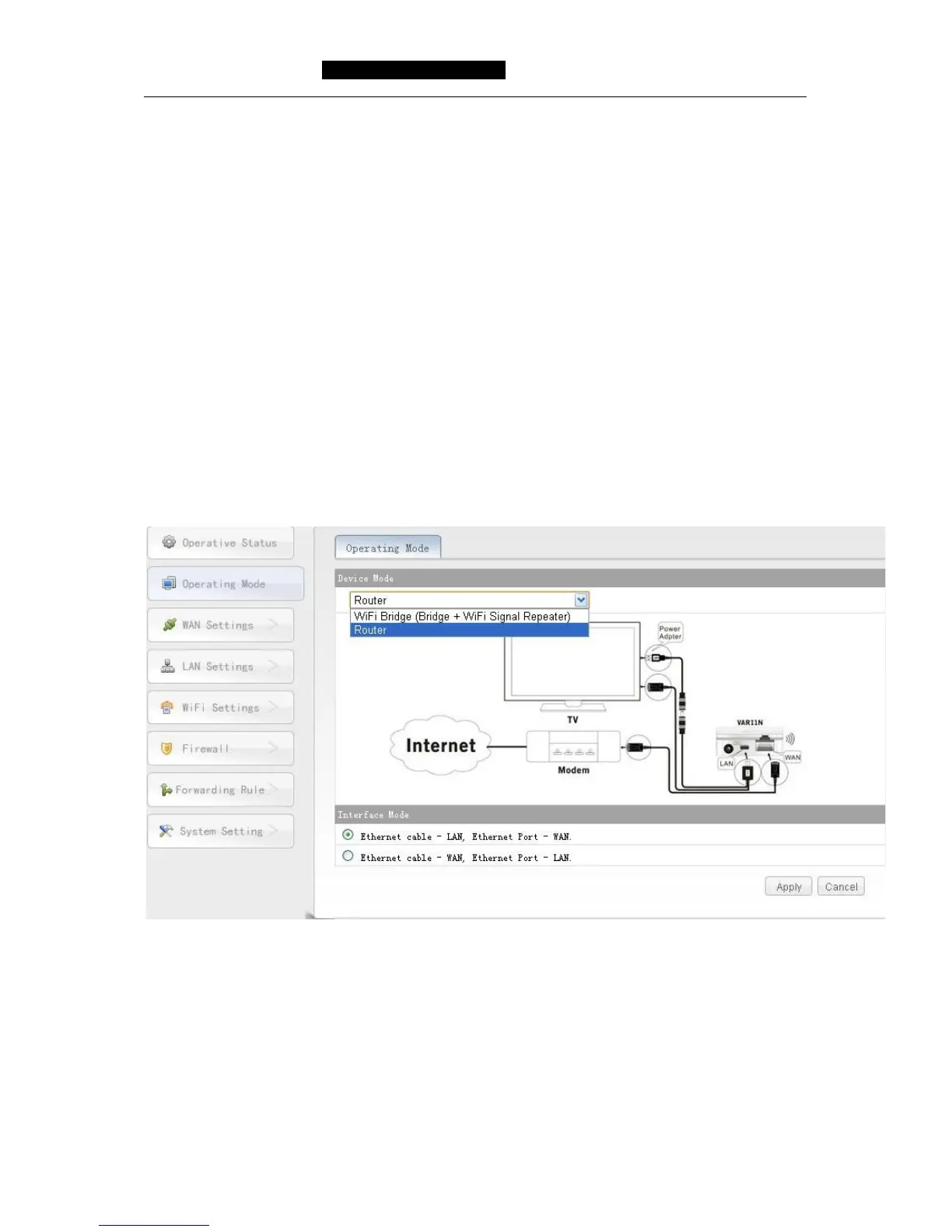 Click operating mode button, can switch operating mode, such as Router mode and