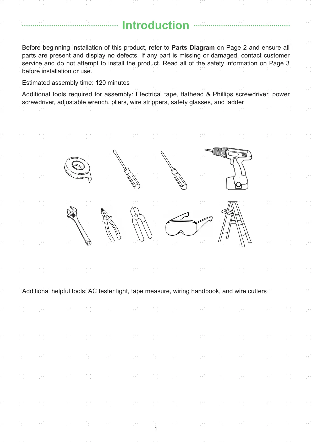 Additional tools required for assembly: Electrical tape, flathead & Phillips screwdriver, power
