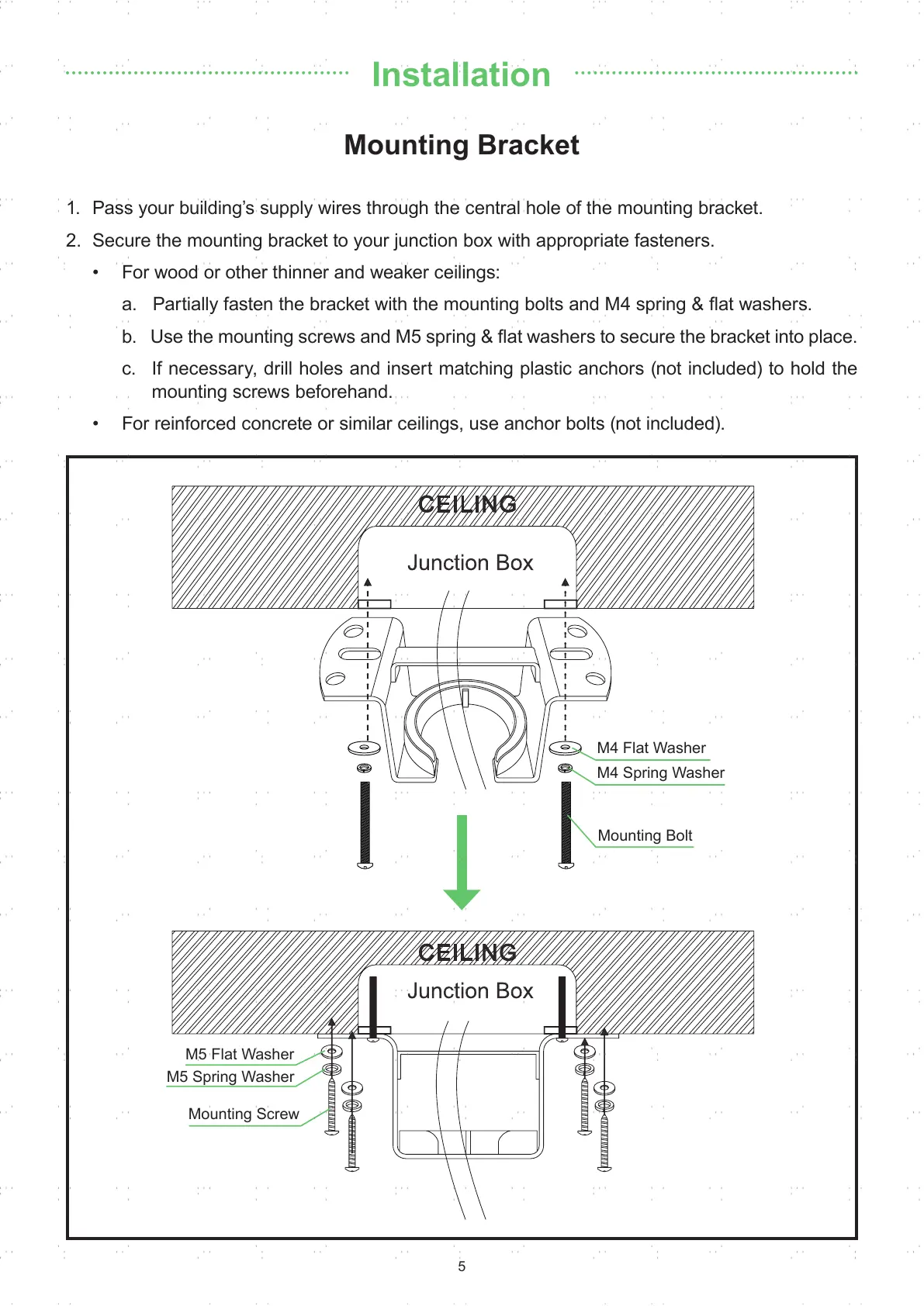 1. Pass your building’s supply wires through the central hole of the mounting bracket.