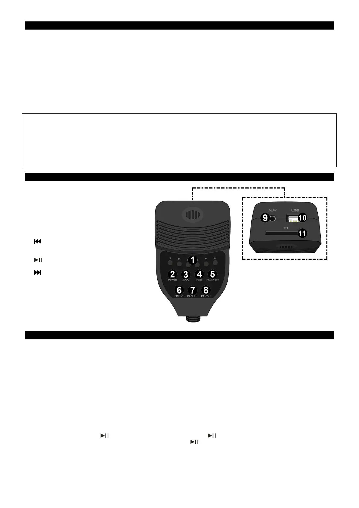 7. Plug in USB or SD card to play music. The megaphone’s led indicator will blink while playing. During the playback of