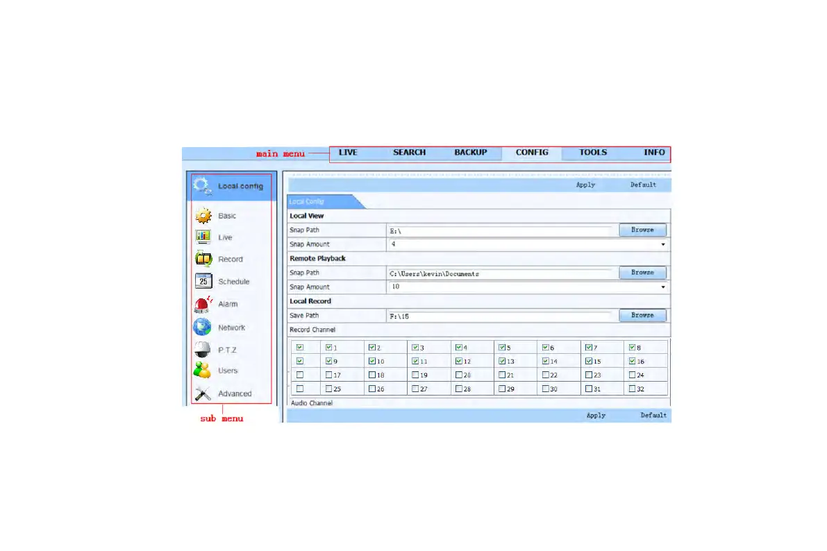 configuration, record configuration, schedule configuration, alarm configuration, network configuration, PTZ configuration and user