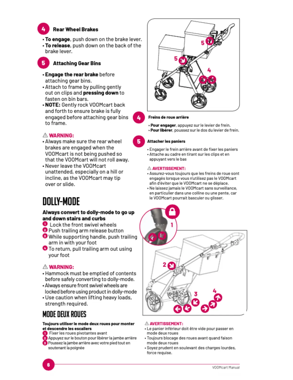 Voom Voomcart - Usage and Modes; Rear Wheel Brakes; Attaching Gear Bins; Dolly-Mode Operation