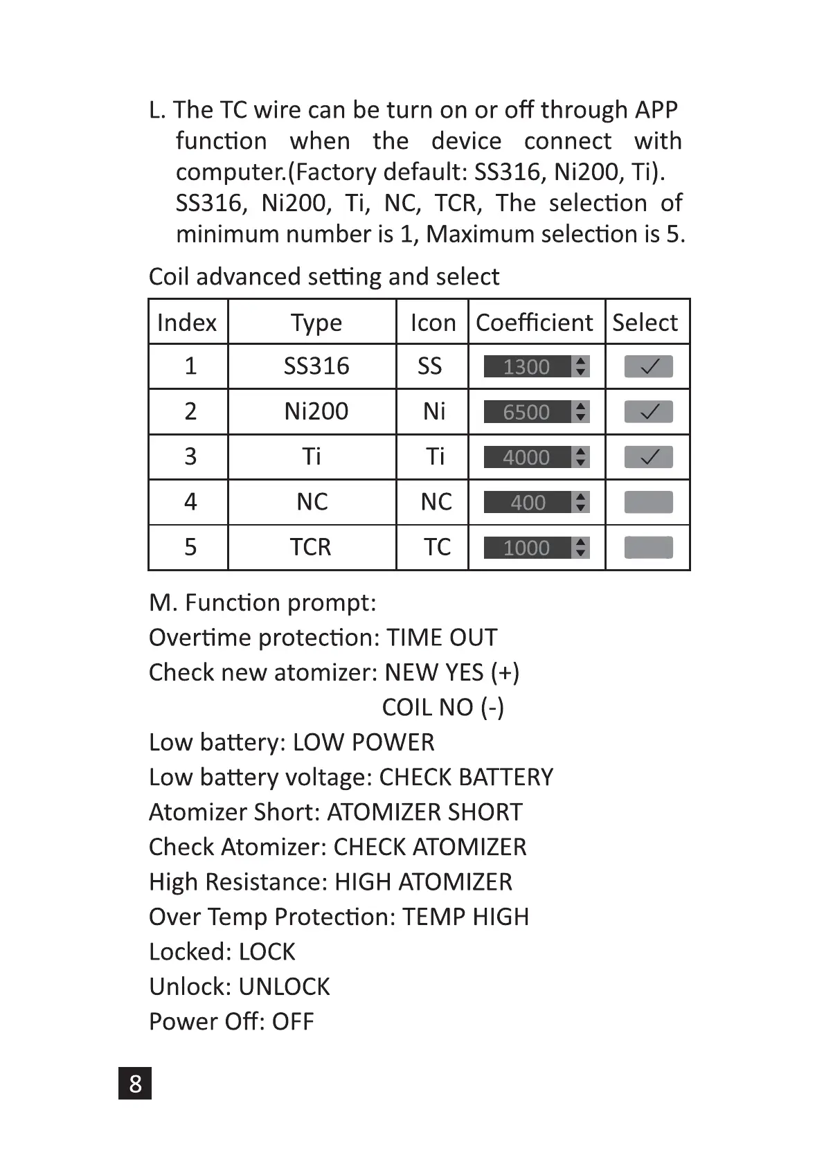 computer.(Factory default: SS316, Ni200, Ti).