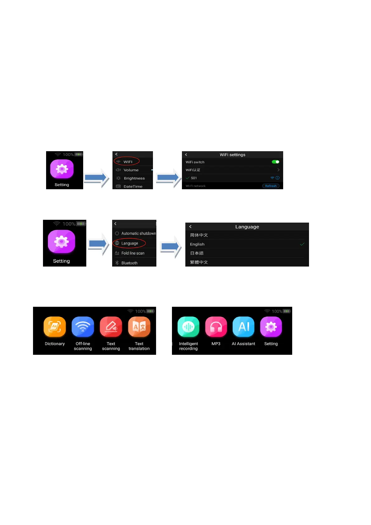 2. Network connection: After turning on the device, go to the Settings--WIFI interface to connect to the