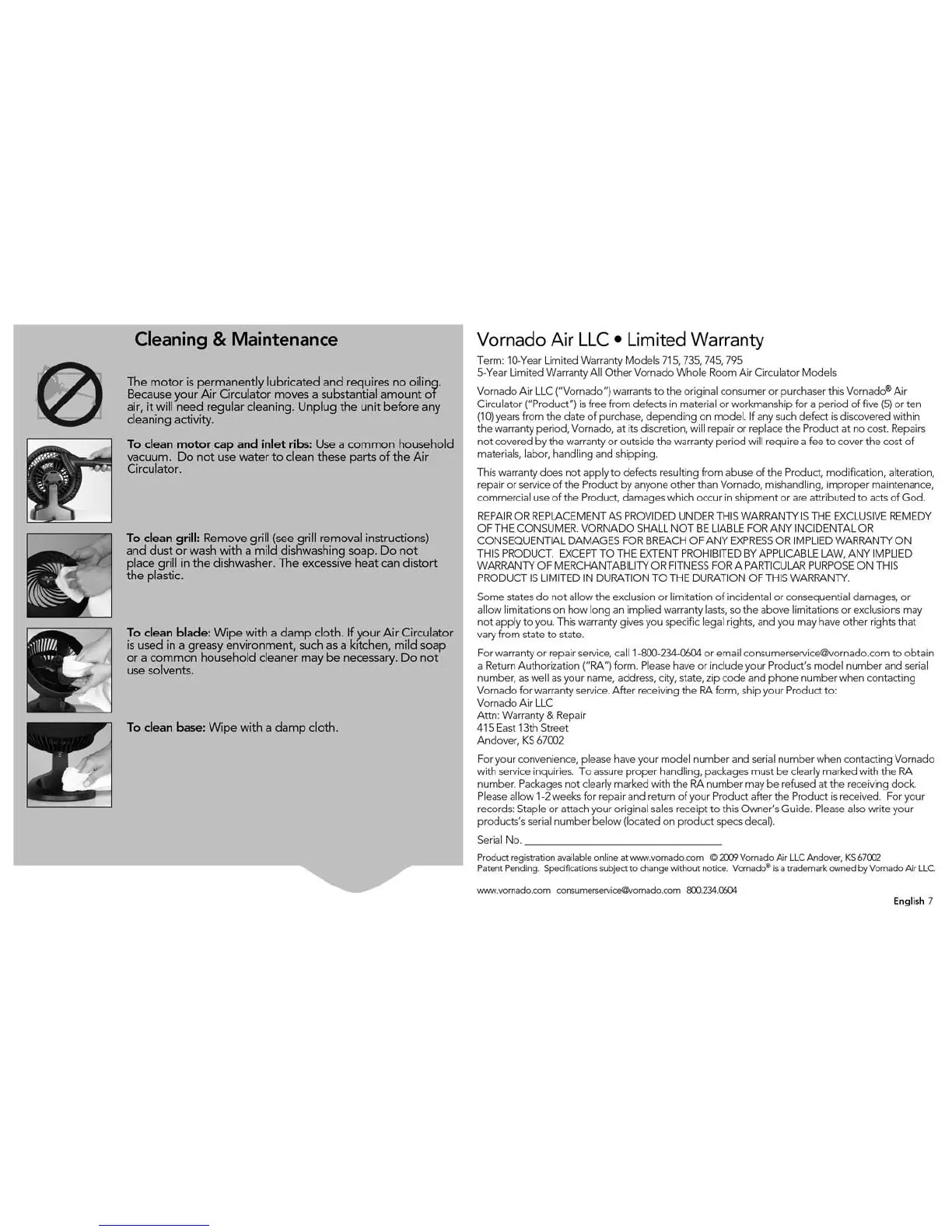 Vornado VORTEX ACTION - Cleaning and Warranty Information; Cleaning and Maintenance Guide; Vornado Limited Warranty Details