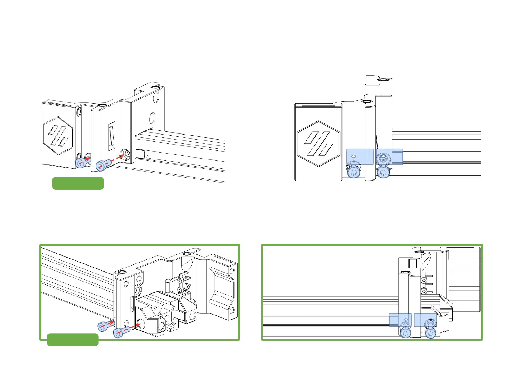 Start each of the 4 M3x8 screws into the M3 T nuts that you inserted earlier. Once all four