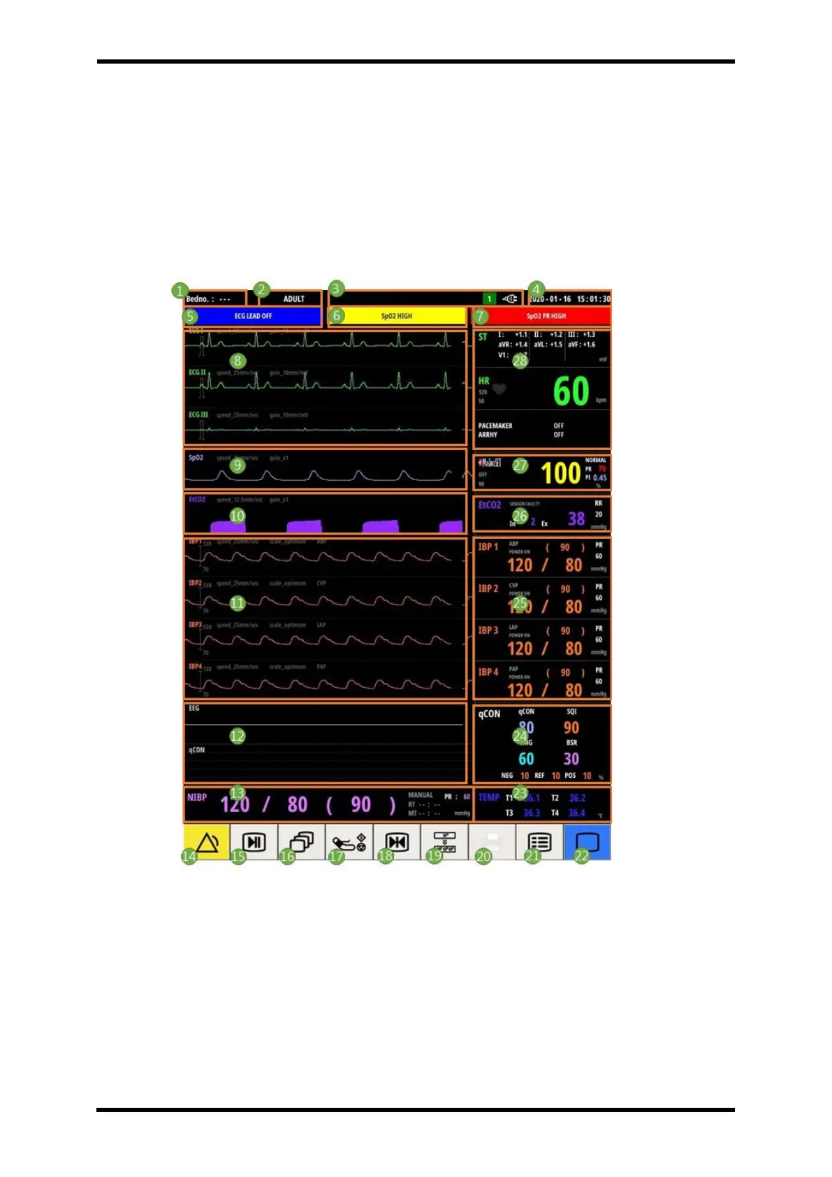 The main screen is consist of ECG, Respiration, SpO2, NIBP, 4ch IBP(Option), CO2(Option),
