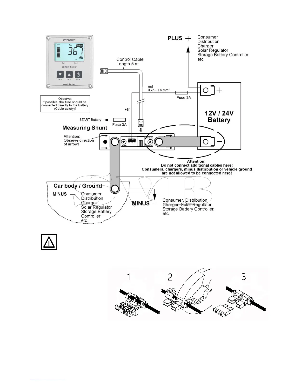 Except of the measuring shunt, no further connection should exist at the negative pole (-) of the battery