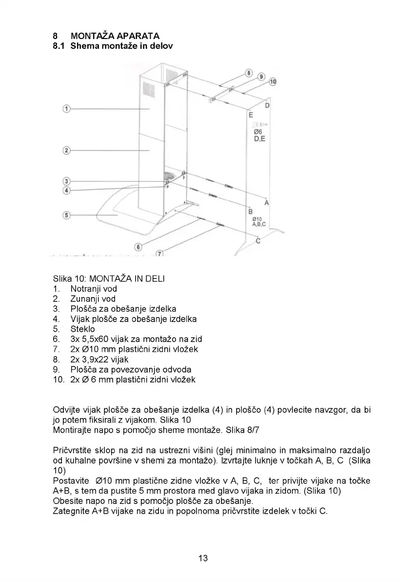 A+B, s tem da pustite 5 mm prostora med glavo vijaka in zidom. (Slika 10)