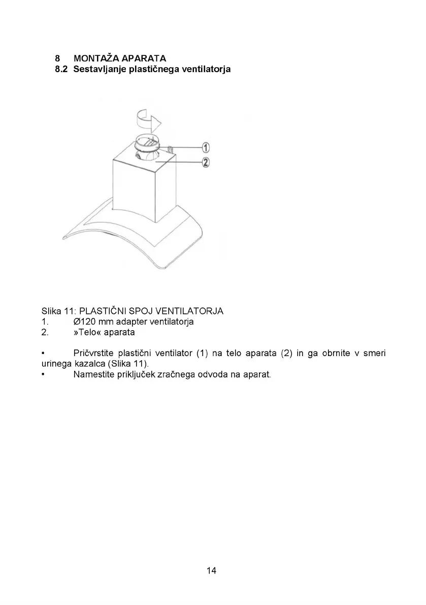 • Pričvrstite plastični ventilator (1) na telo aparata (2) in ga obrnite v smeri