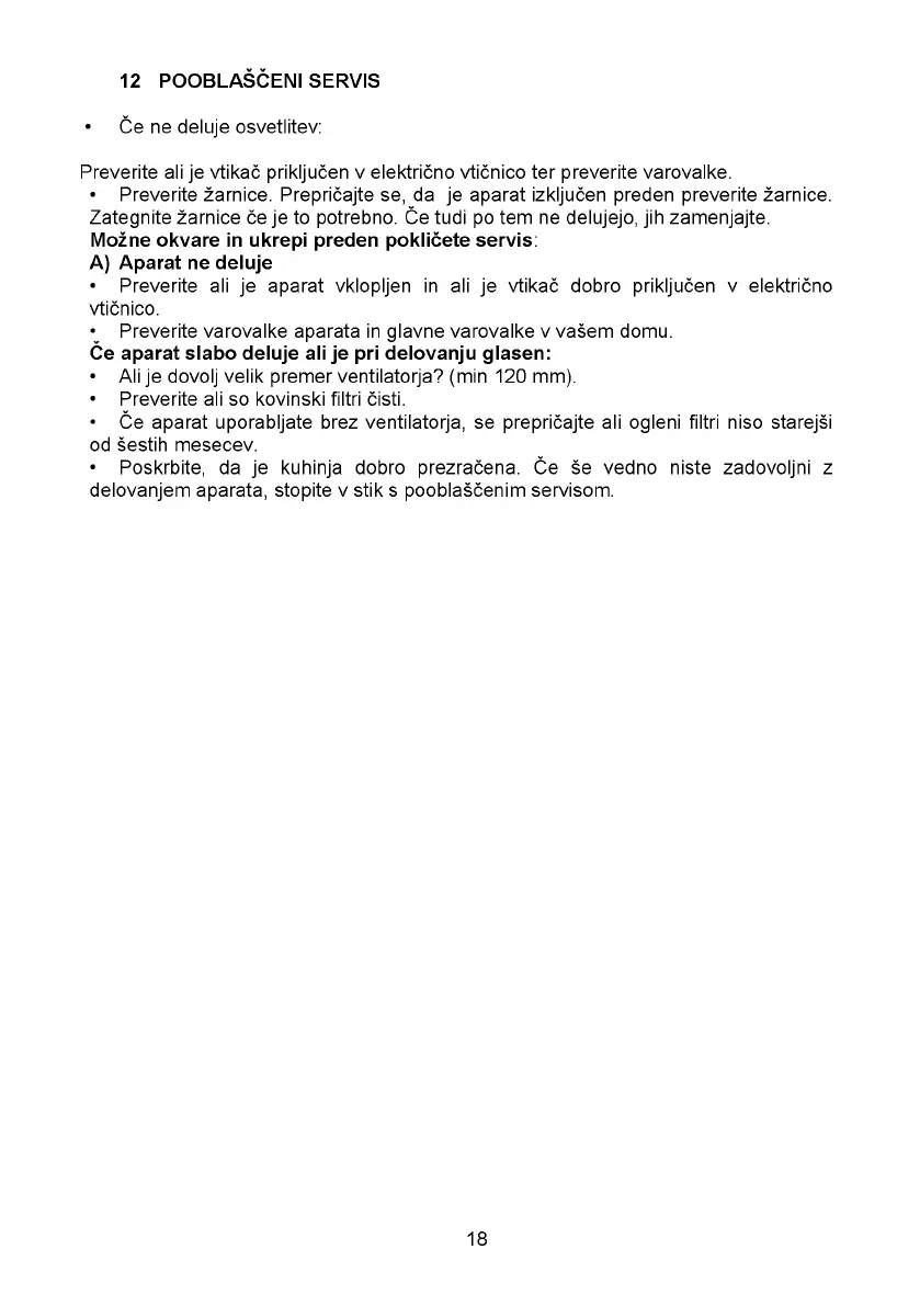 • Preverite žarnice. Prepričajte se, da je aparat izključen preden preverite žarnice.