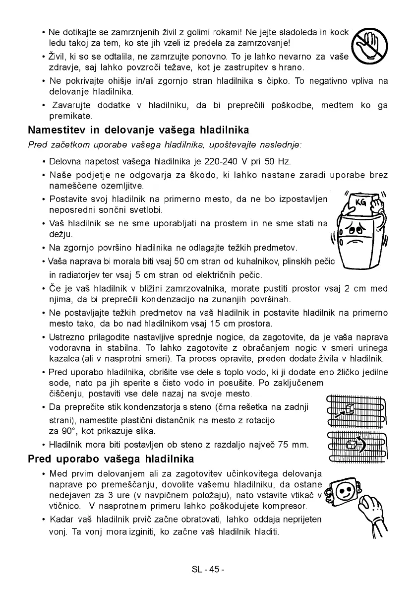 • Hladilnik mora biti postavljen ob steno z razdaljo najvec 75 mm.