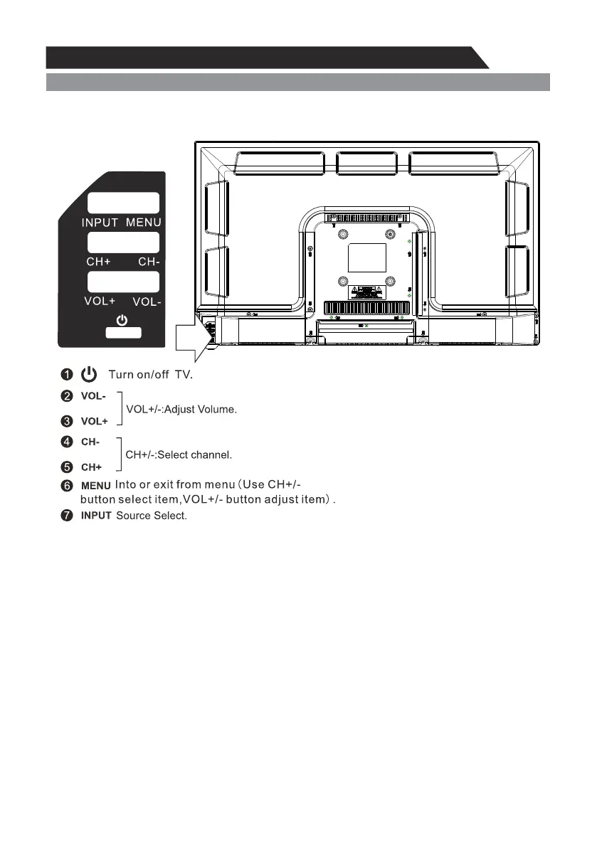 The buttons on the lower-right panel control your TV’s basic features, including the on-screen menu.