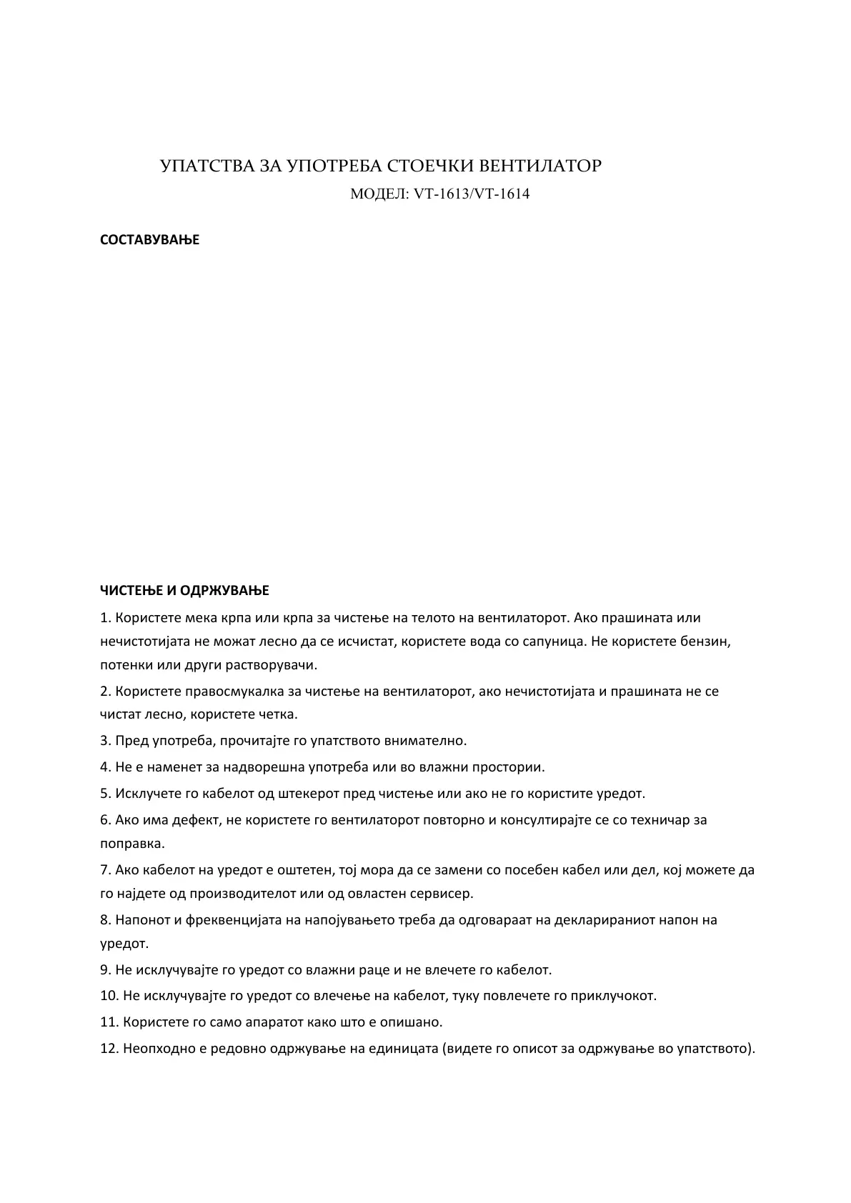 УПАTСТВА ЗА УПОТРЕБА СТОЕЧКИ ВЕНТИЛАТОР