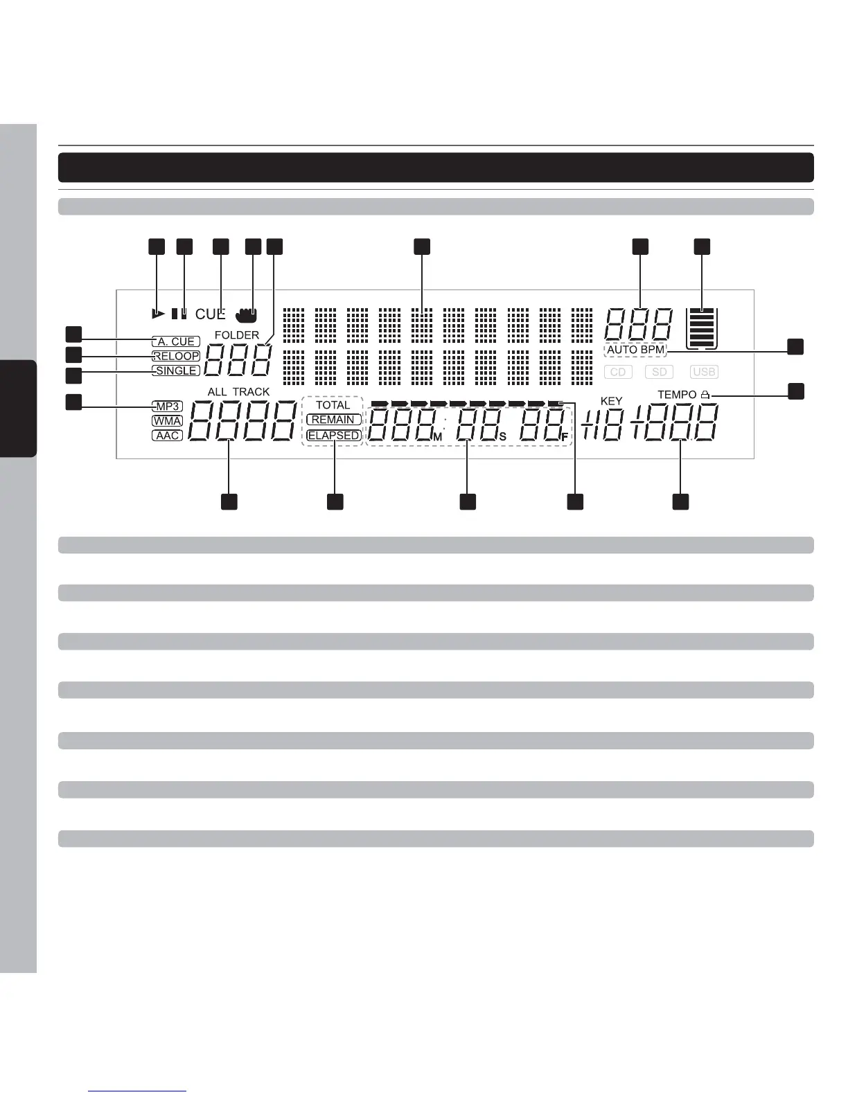 Indicates the name of the folder, artist, fi le, album, genre and title while playing a MP3 with ID3 TAG .